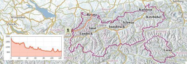 整个线路穿过Tyrol(蒂罗尔州是奥地利西部的一个州,为多山地区,蒂罗尔州分成两个部分,即北蒂罗尔和东蒂罗尔,两地相距约为10-20公里。其中面积较大为北蒂罗尔),横跨整个区域,总长度大概413公里,分成33段。Kaiser 山脉和Kaiser 之间分成24段,Venediger和Groglockner 山脉之间分成9段。总爬升31000米,总下降20000米。