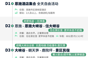 后乘车返回恩施,领队会将大家送到恩施机场和恩施火车站。大概17:30到达,建议定18:30及之后的机票和火车票(旺季及节假日排期,预计延后1小时,以免耽误行程)。如预定次日大交通返程,可提供代订住宿服务。