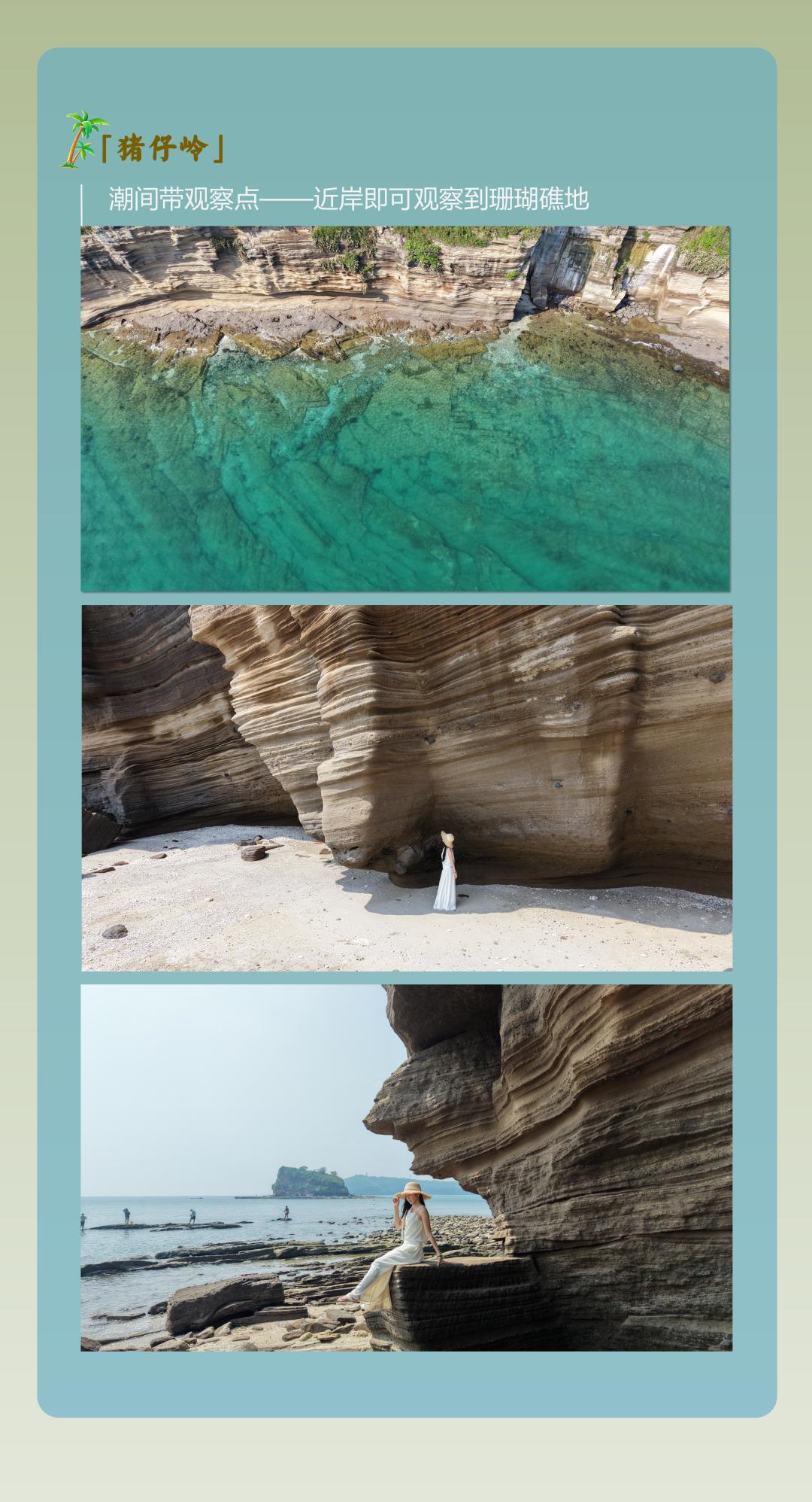 14:30 乘坐观光车进行环岛游,去人迹罕及的猪仔岭拍摄大片,潮位合适的时候我们在岸边观察活体珊瑚、潮间带生物,途径环岛咖啡、蓝桥、贝壳沙滩等风景优美的区域,边喝咖啡边欣赏优美的景色;