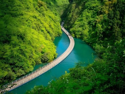 我们将带领大家前往浮桥全景拍摄处,从此地俯瞰下去,整条河流呈现出一道半圆弧+S形走向,就像镶嵌在两座山峰之中的绿宝石,弯弯曲曲地伸向远方,最后消失在视线之外。随后,我们漫步在【网红悬浮桥】上,感受水浪的波动。