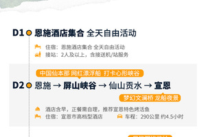 餐后大家便乘车返回恩施,领队会将大家送到恩施机场和恩施火车站。大概17:00到达,建议定18:00及之后的机票和火车票。(节假日排期预计延后1小时),以免耽误行程。如预定次日大交通返程,可提供代订住宿服务。