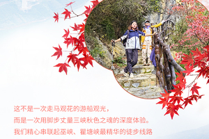我们将乘车前往巫山神女天路,走一段风景绝佳的红叶路线,在如火如荼的红叶里穿梭,近距离接触红叶。一路穿越巫峡,欣赏“曾经沧海难为水,除却巫山不是云”的壮观景象,一路红叶相伴,美不胜收,这里也被驴友评为长江上最美的三峡画廊。