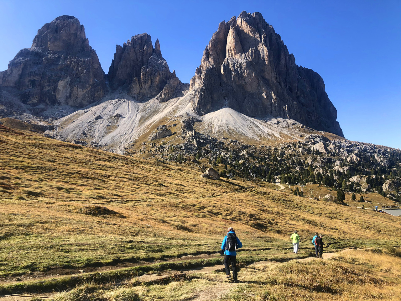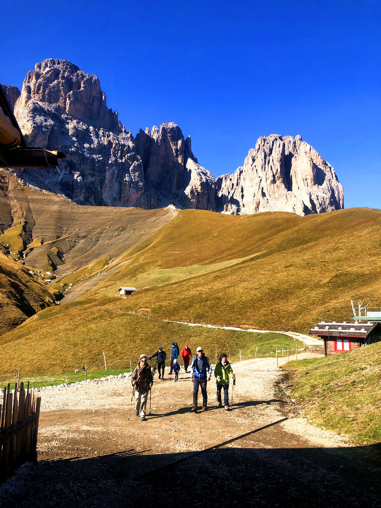 沿着休斯山大草甸前往大山的深处,一路上怪石林立的群峰将伴随我们左右,白云石那种斧砍刀切般的典型山体样貌将全数呈现在我们眼前。 我们会经过著名的平石山Sasso Piatto,午餐在Sella塞拉山口的木屋享用。在山口做短暂休息后,穿过石头城,徒步前往山区最古老名族拉登人聚居的加尔代纳山谷。