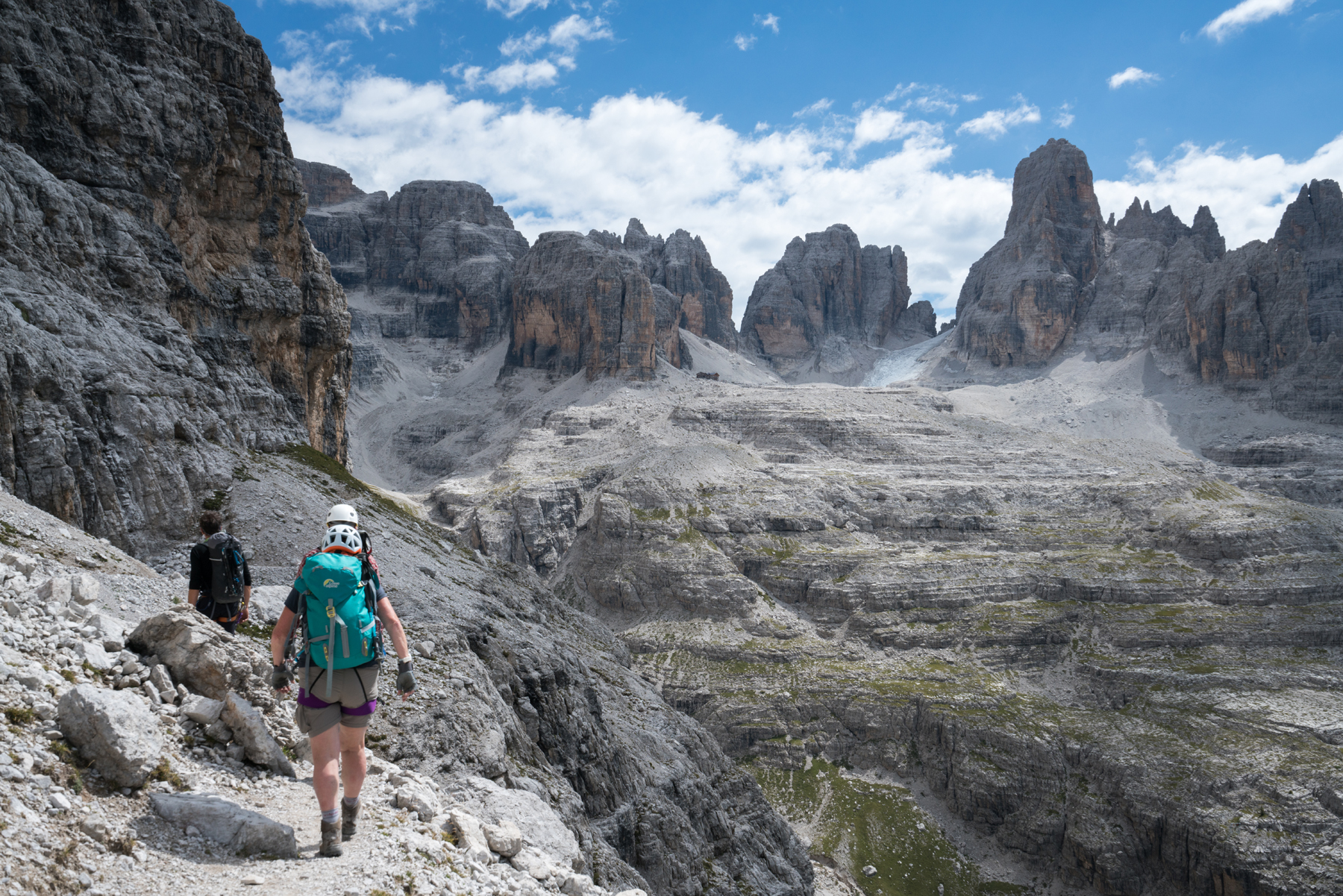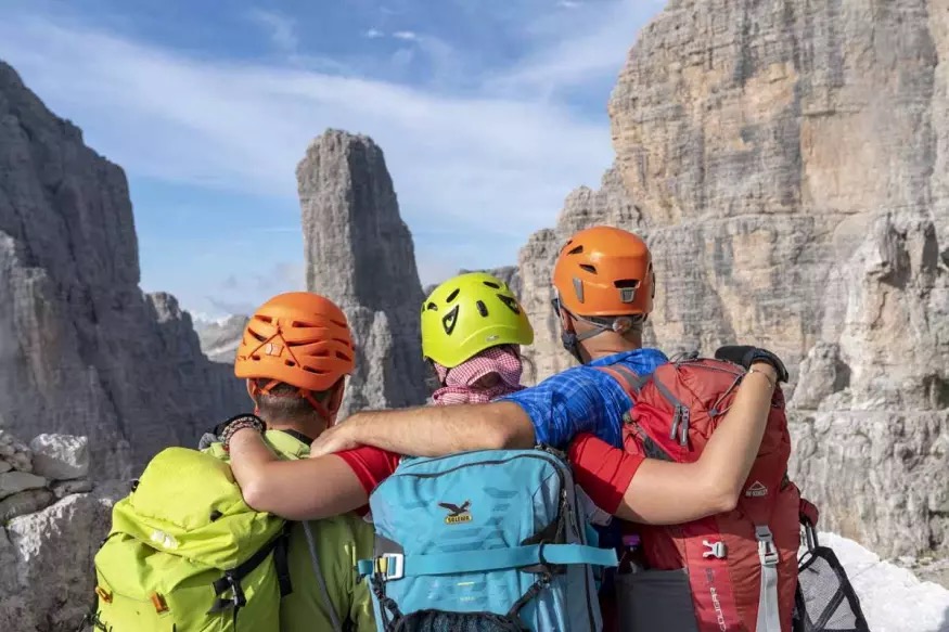 在第一次世界大战时期,意大利和奥匈帝国的军队的分界线穿过多洛米蒂山,并首次在多洛米蒂山建立了保护性小路,这为后来的攀岩运动创造了条件。很多游客来到多洛米蒂山铁索攀岩。这是一种在路线上设置铁索、金属脚蹬甚至梯子以保证安全性的攀岩方式。很多长距离的徒步小径贯穿多洛米蒂山,被称为“Alte vie”(高空小径),这些小径从1到8编号,至少需要一周的时间才能穿过山峰,沿途设有大量棚屋。