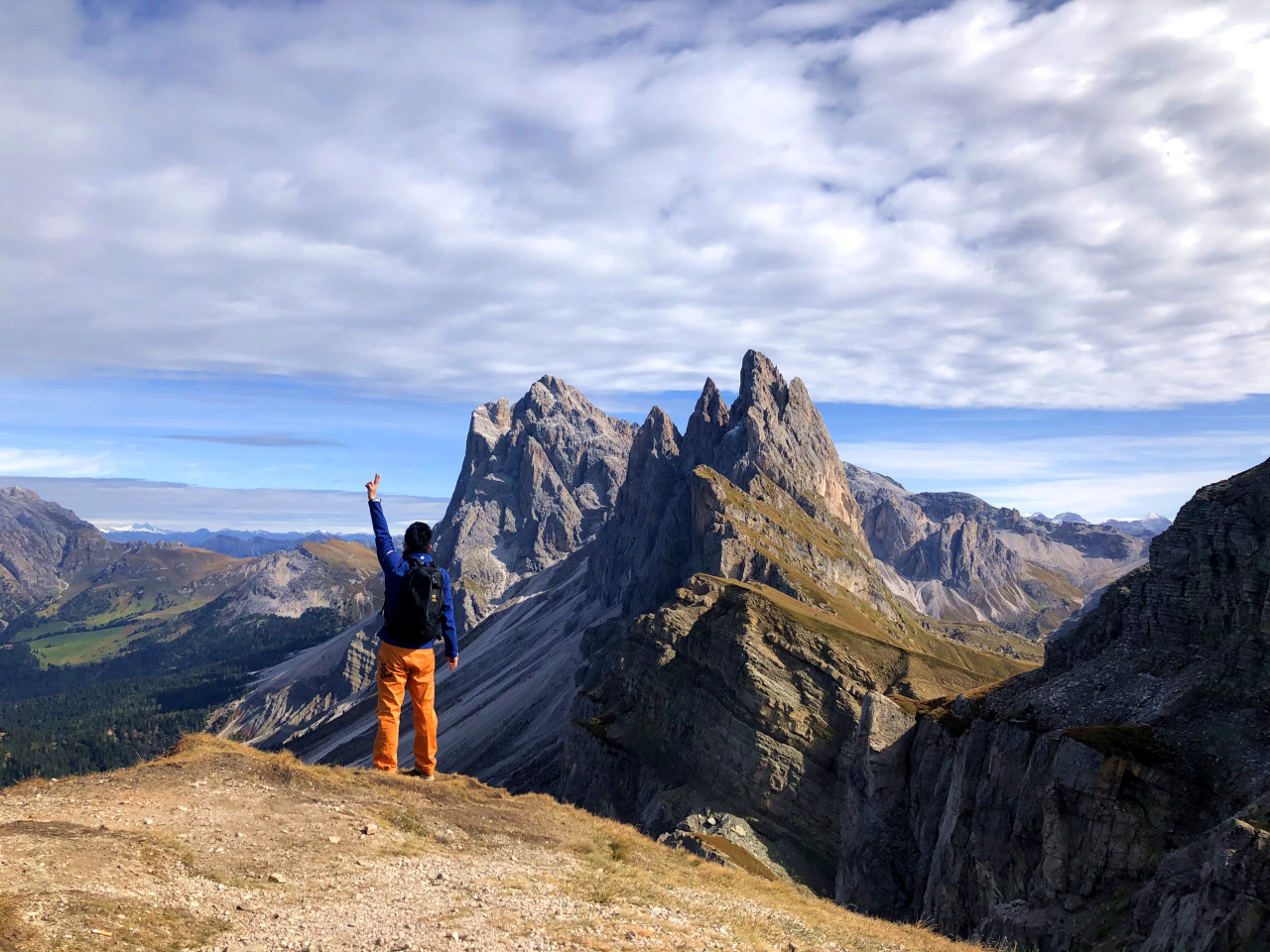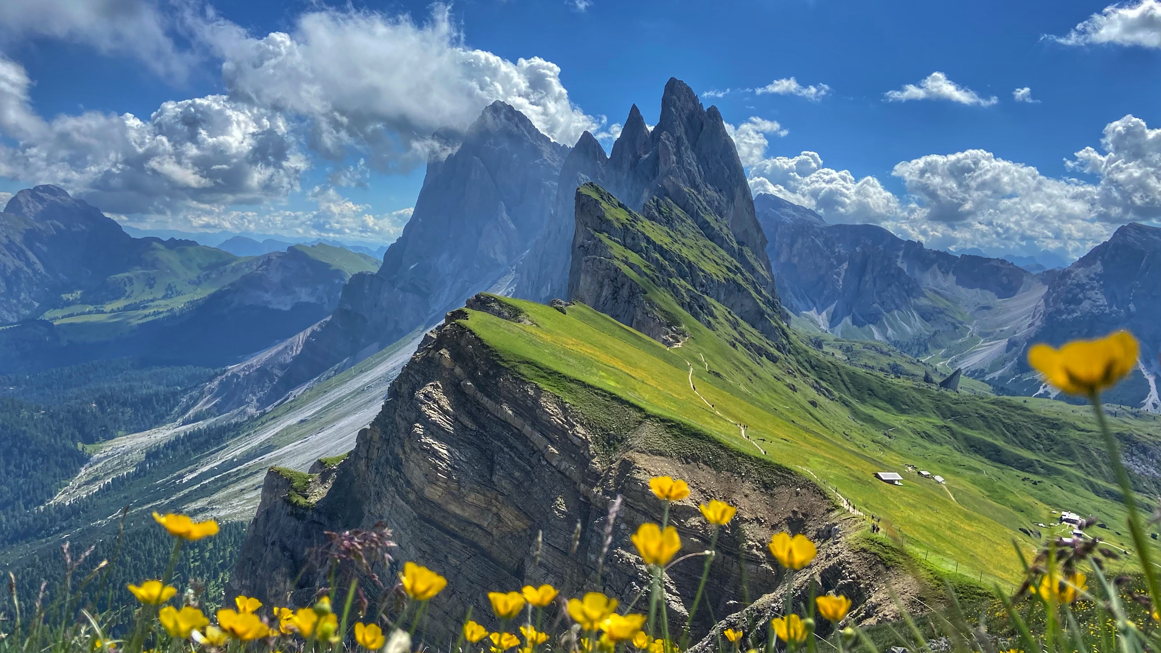 我们多数人把它俗称"刀片山.但是多洛米蒂山区叫"Seceda"山峰一面为刀削般的绿色草坡,另一面则是几乎垂直的陡峭银白色山体,一排山峰如犬齿般尖耸而交错起伏,险峻磅礴。在Seceda所处位置看过去是侧面的角度,而正面角度的奥德利山脉(从奥蒂塞伊坐着滑雪缆车可达多洛米蒂最著名的山峰——险峻尖耸的奥德利山脉(Gruppo di Odle/Geisler(盖斯勒山脉))群峰在富内斯山谷就能看到。