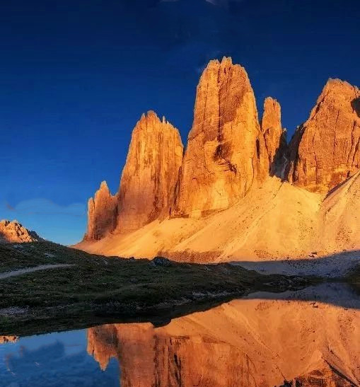 三指峰(Tre Cime di Lavaredo)是多洛米蒂山脉中极为著名、典型的山峰,岩体陡峭壮观,周边深受徒步和登山爱好者青睐,转山的朝圣,在这三座巍峨耸立的山峰四围。每次转身,脚下不尽的层峦叠嶂和绵延向天尽头的美景,都是最完美的收获。