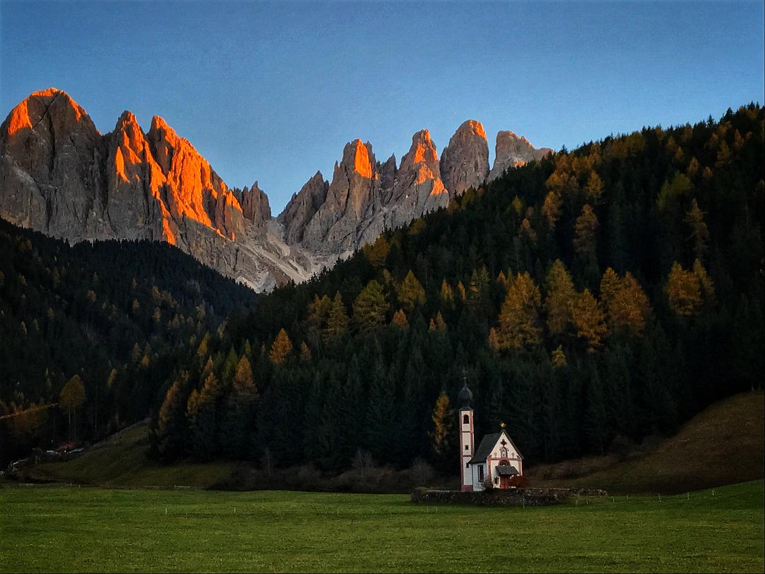 富内斯山谷有很多值得探索的景点,但最著名的是圣马格达莱纳教堂(Chiesa di Santa Maddalena)和圣约翰教堂(Chiesa di San Giovanni)。富内斯山谷以教堂背对山腰的全景而闻名,但从教堂本身看出去的景色同样令人惊叹。这两个传说中的圣地虽然很小,但却给旅行者留下了山一般大的印象,就像向北的奥德尔山峰一样,它们是富内斯山谷的象征。教堂尖塔耸立在群山之中,这一令人惊叹的场景使它们成为南蒂罗尔最上镜的教堂