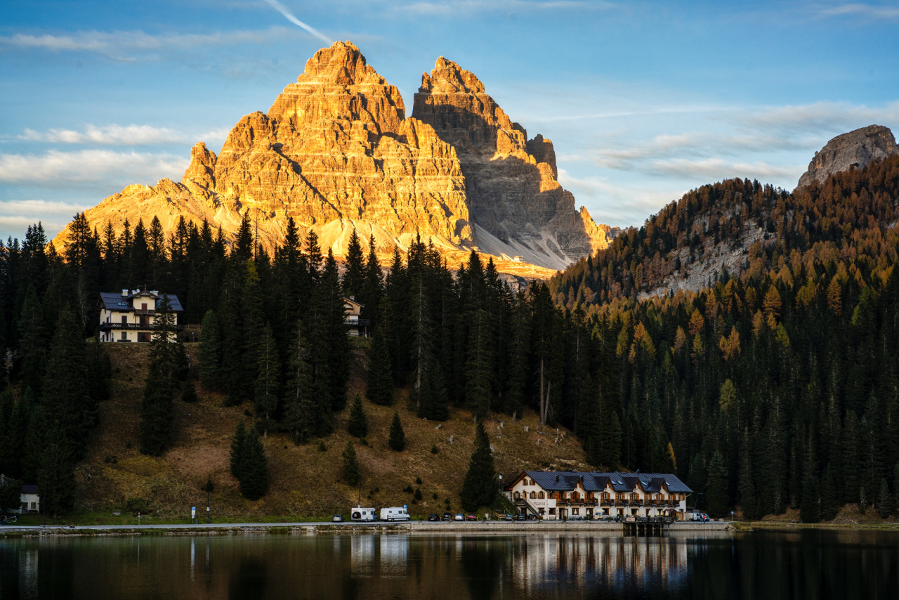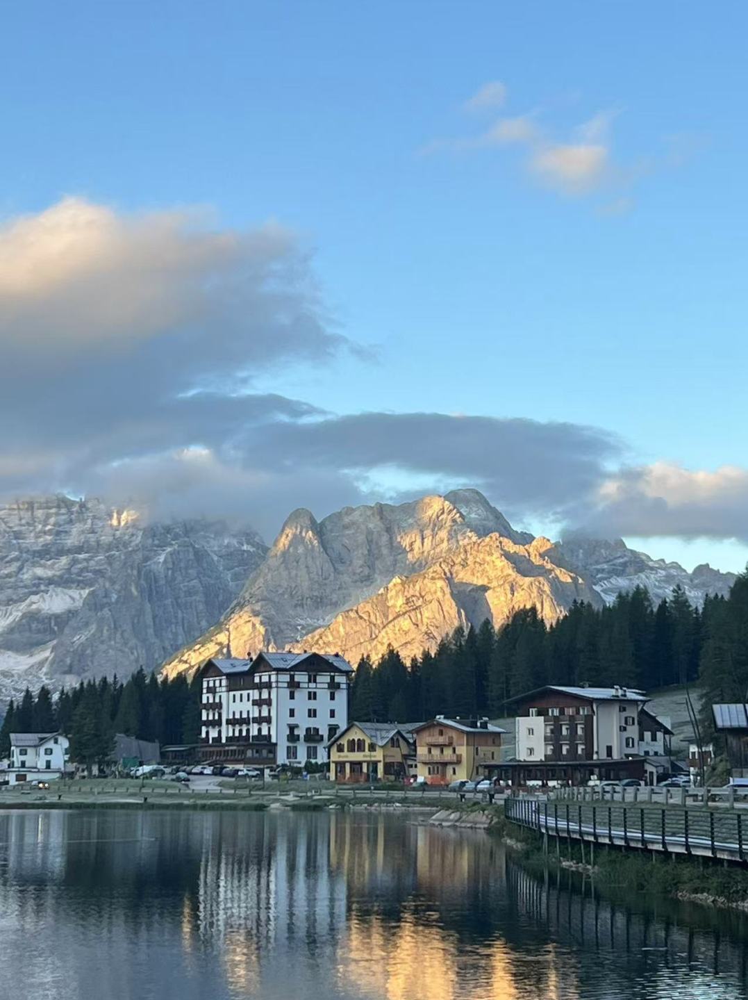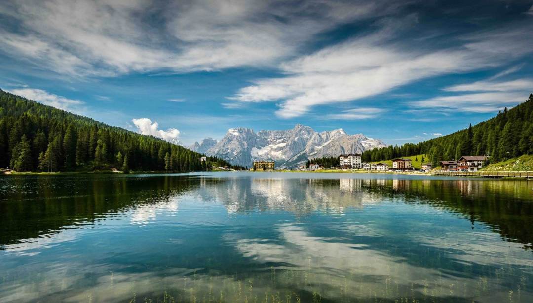 Lago di misurina,位于Cortina d'Ampezzo东北约10公里处,坐落在数座酒店和度假别墅旁,东西两侧被森林环抱。背倚3216米的Cristallo群峰,面对多洛米蒂的标准 -- 拉瓦雷多三尖峰 (Tre Cime di Lavaredo,最高峰2999米),群山环抱守护着这颗“多洛米蒂的珍珠”。每逢冬季湖面封冻时,她是运动溜冰的场所,这里会举办精彩的冰上运动项目,也是多洛米蒂山区最美丽的湖泊之一。