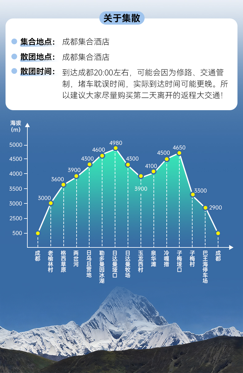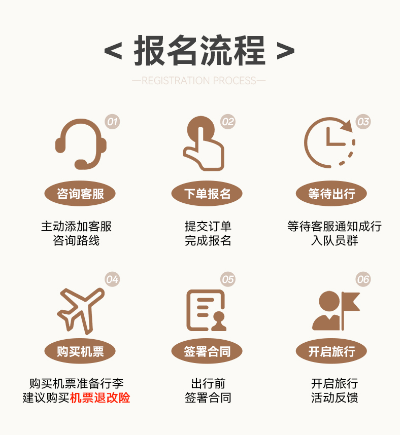 活动成团说明: A.我们会在第一时间通知成团信息,最晚会在出行前7天通知; B.若人数不足成团标准,可改期至其他日期或无损退团退款: C.建议小伙伴们报名活动确认成团后,再购买大交通,以避免不必要的损失。 |