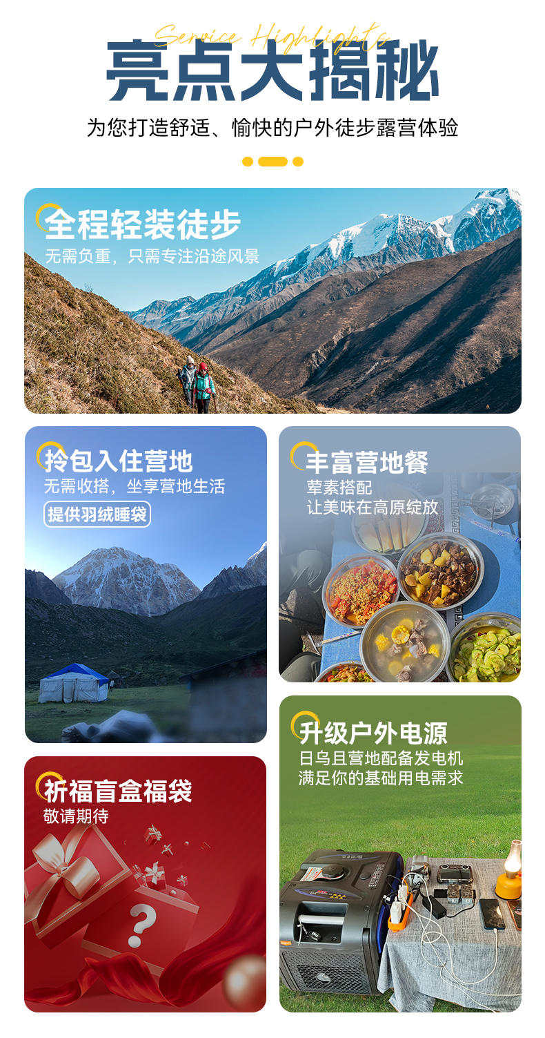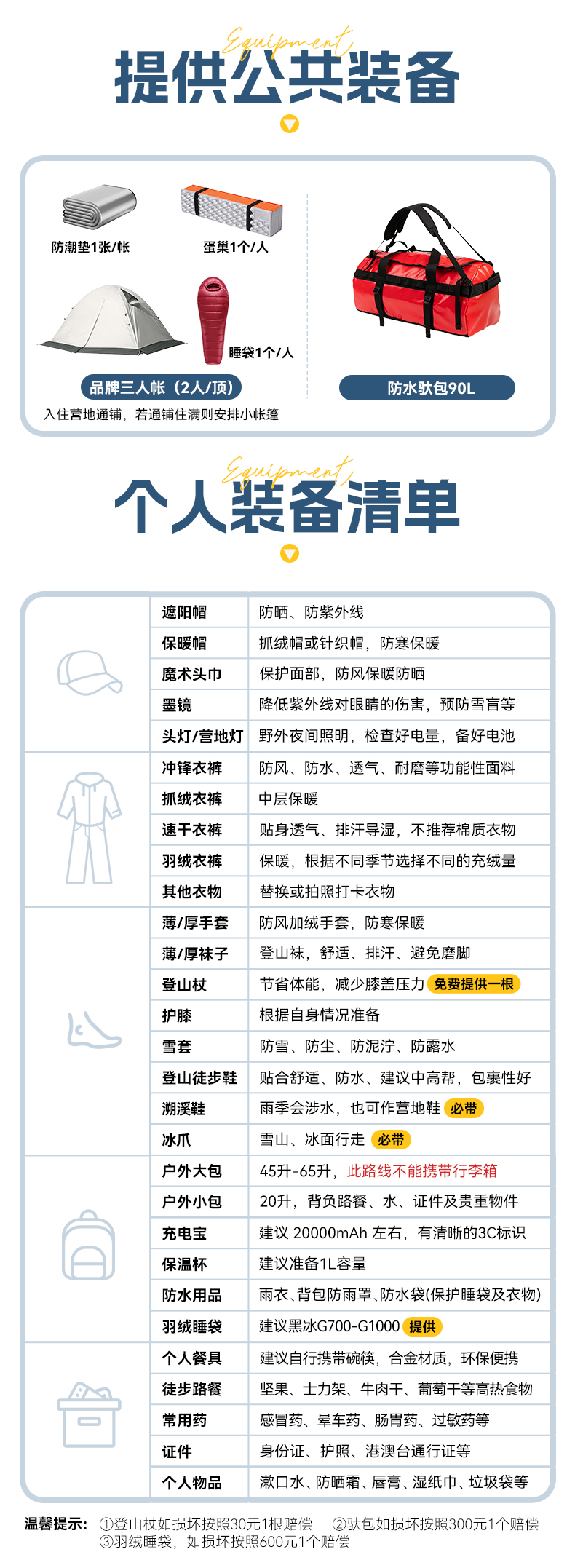 ● 驮运:包含徒步期间个人装备驮运费用。(每人限重15KG,如超重每公斤200元,依次叠加)。