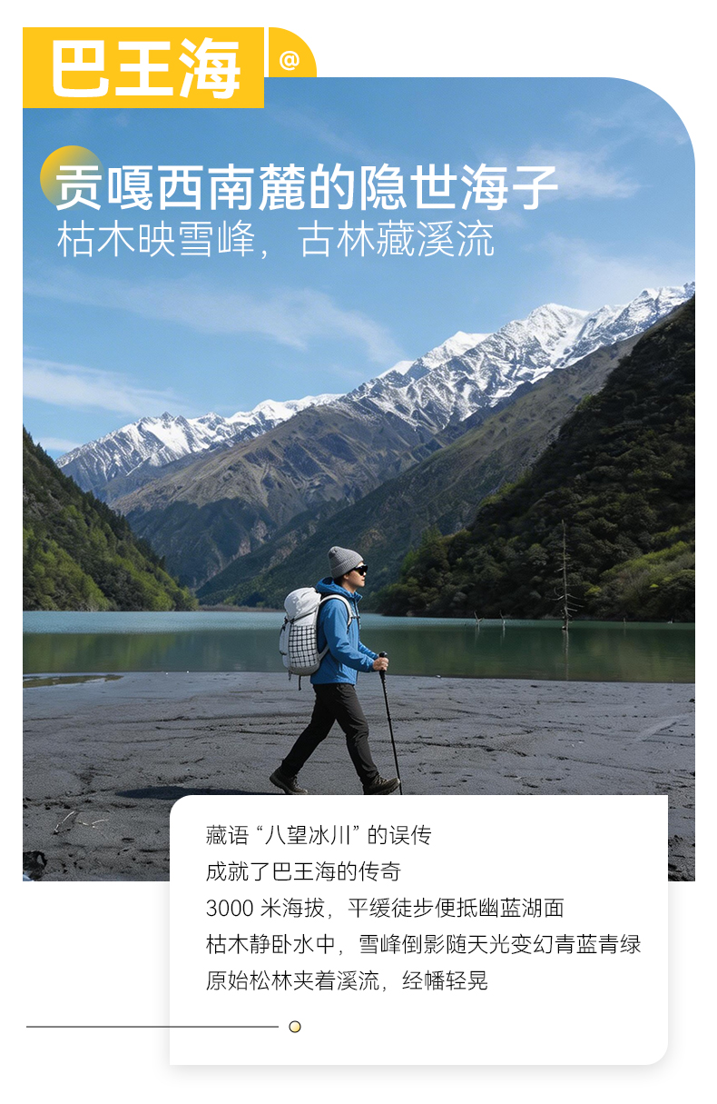 ● 门票:泉华滩卫生费20元/人、冷嘎措卫生费30元/人、巴王海卫生费10元/人。