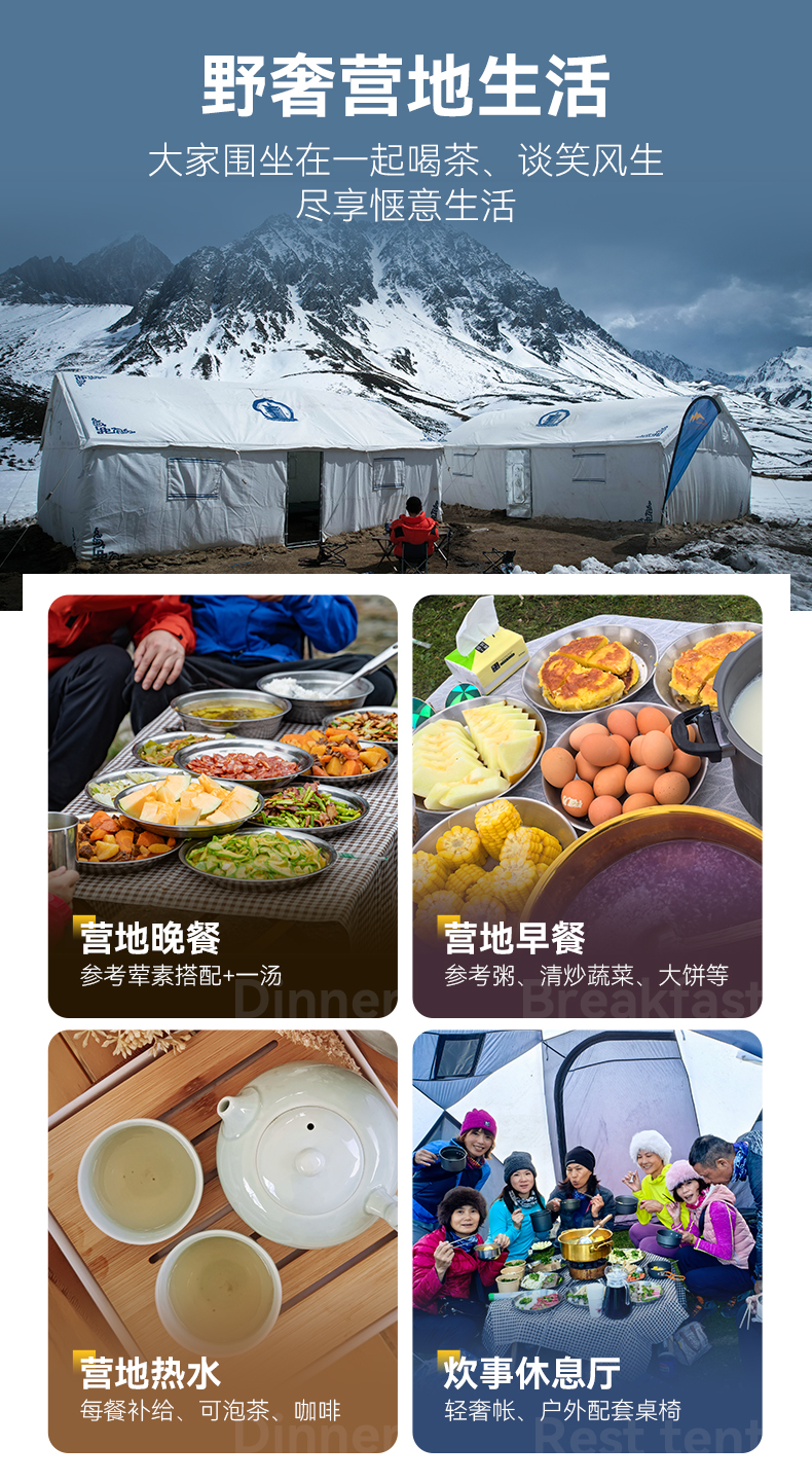 ● 营地:包含营地费(自带帐篷除外)。