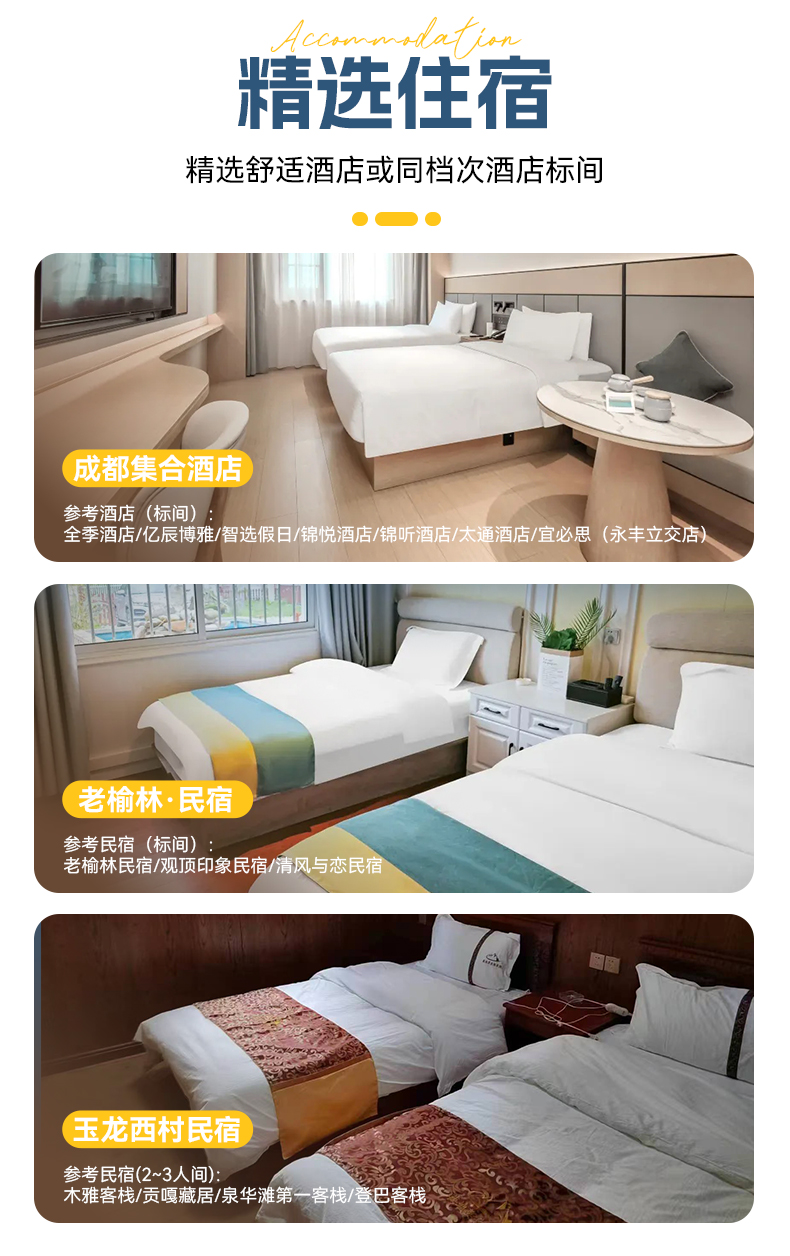 ● 住宿:按行程所列标准入住2晚酒店,2晚藏家民宿,2晚露营。(详情请参见行程安排。)