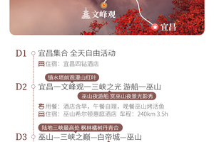 全国各地请根据动车、飞机时刻自行抵达宜昌,工作人员会根据宜昌航班或者火车的落地时间,执行接站/机。送达酒店后,报“红叶醉三峡+姓名”,登记入住。