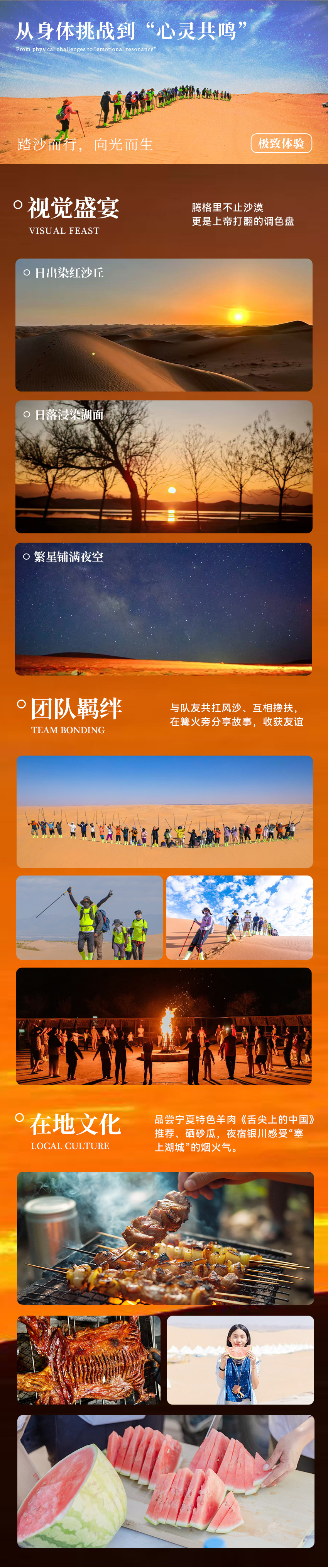 02 在自由活动期间,如果没有购买需求,不要和当地人讨价还价,也不要过多的驻足观看。如果队员自愿购物,请自行甄别产品质量。客人在沙漠徒步过程中以及在银川市区的购买行为属于个人行为,和此次徒步活动无关,购买过程中任何纠纷与组织方无关。