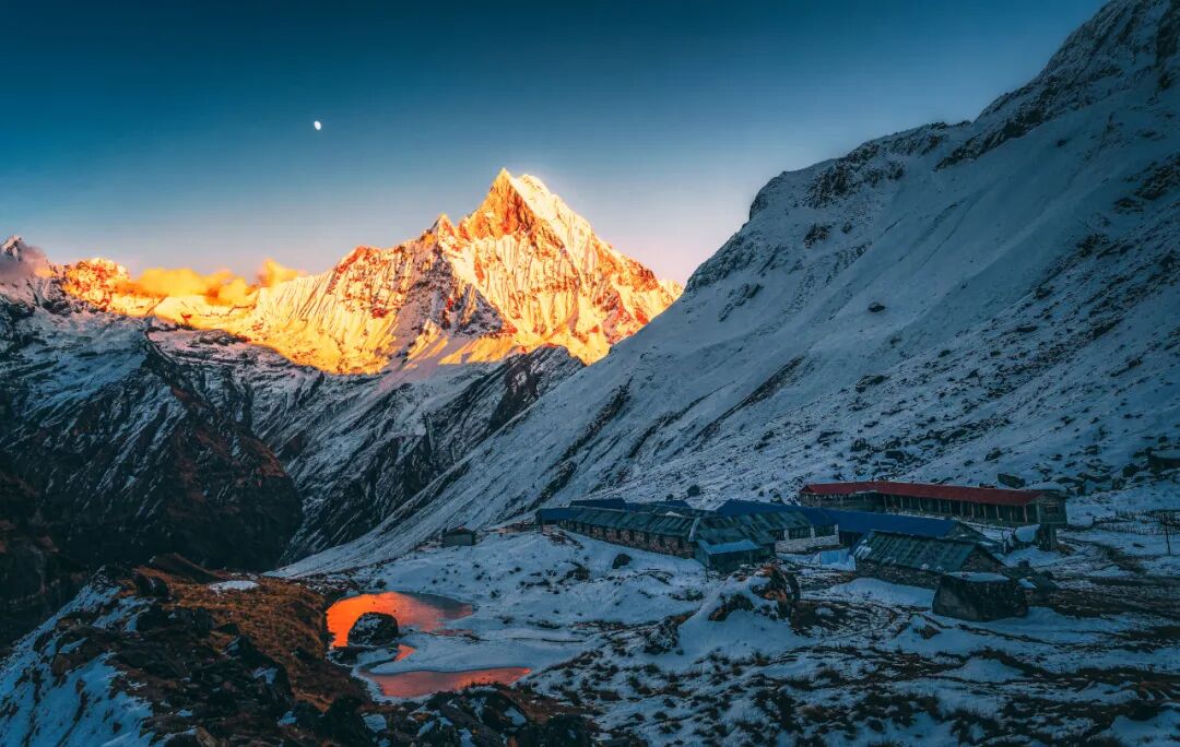 今天是比较轻松的一天,徒步距离与时间都不长。早餐后从Dovan出发,一路向上爬升,抵达Deorali,下午有足够的时间洗洗晒晒,也可以好好适应进入3000米以上的海拔,从Deorali 午饭后出发,经过MBC(鱼尾峰大本营),再向上走就到了ABC(安纳普尔娜大本营),在这儿可回望鱼尾峰的日落金山。