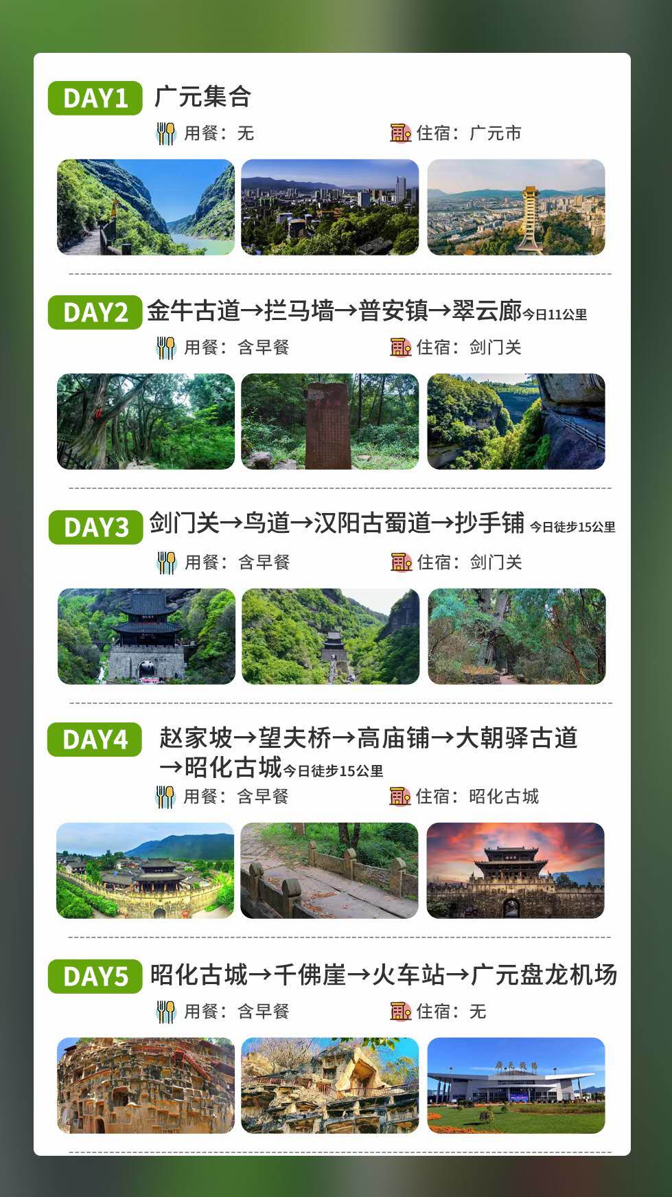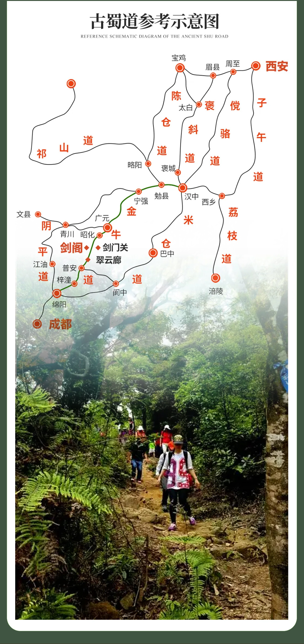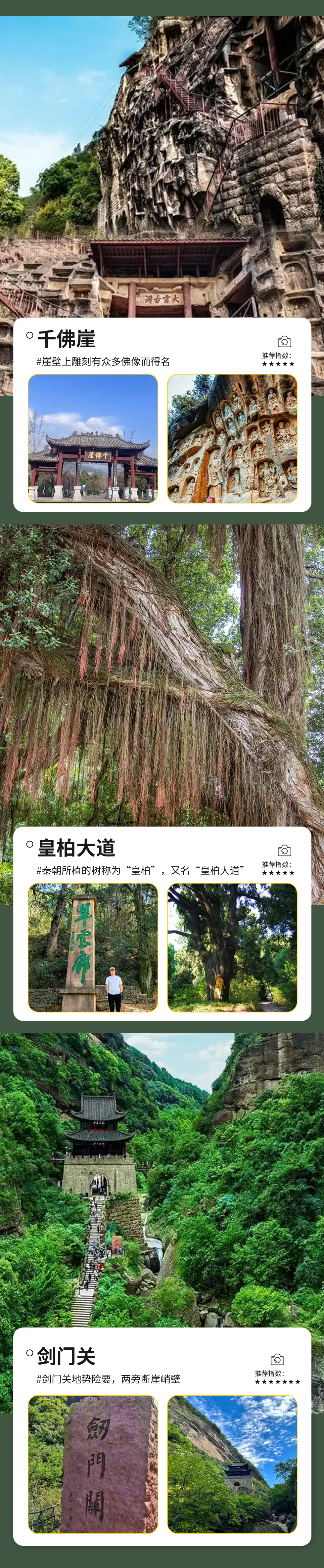 古柏参天:道路两旁有成百上千棵树龄超千年的古柏树,造型各异,遮天蔽日,仿佛置身于绿色的隧道之中,之后前往翠云廊。先秦至秦汉:蜀地内外人们因交流交通需求,开凿了穿越秦岭、大巴山的千里蜀道,形成关中—汉中—蜀中经济文化带,徒步结束后,安排入住酒店,吃饭很方便,美食众多,大家自由选择。