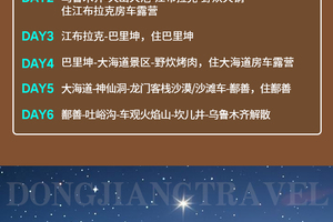 1、住宿:乌鲁木齐4钻酒店双人标间1晚,巴里坤4钻酒店双人标间1晚,江布拉克景区停车区房车露营1晚,鄯善4钻酒店双人标间1晚,大海道景区停车区房车露营1晚;