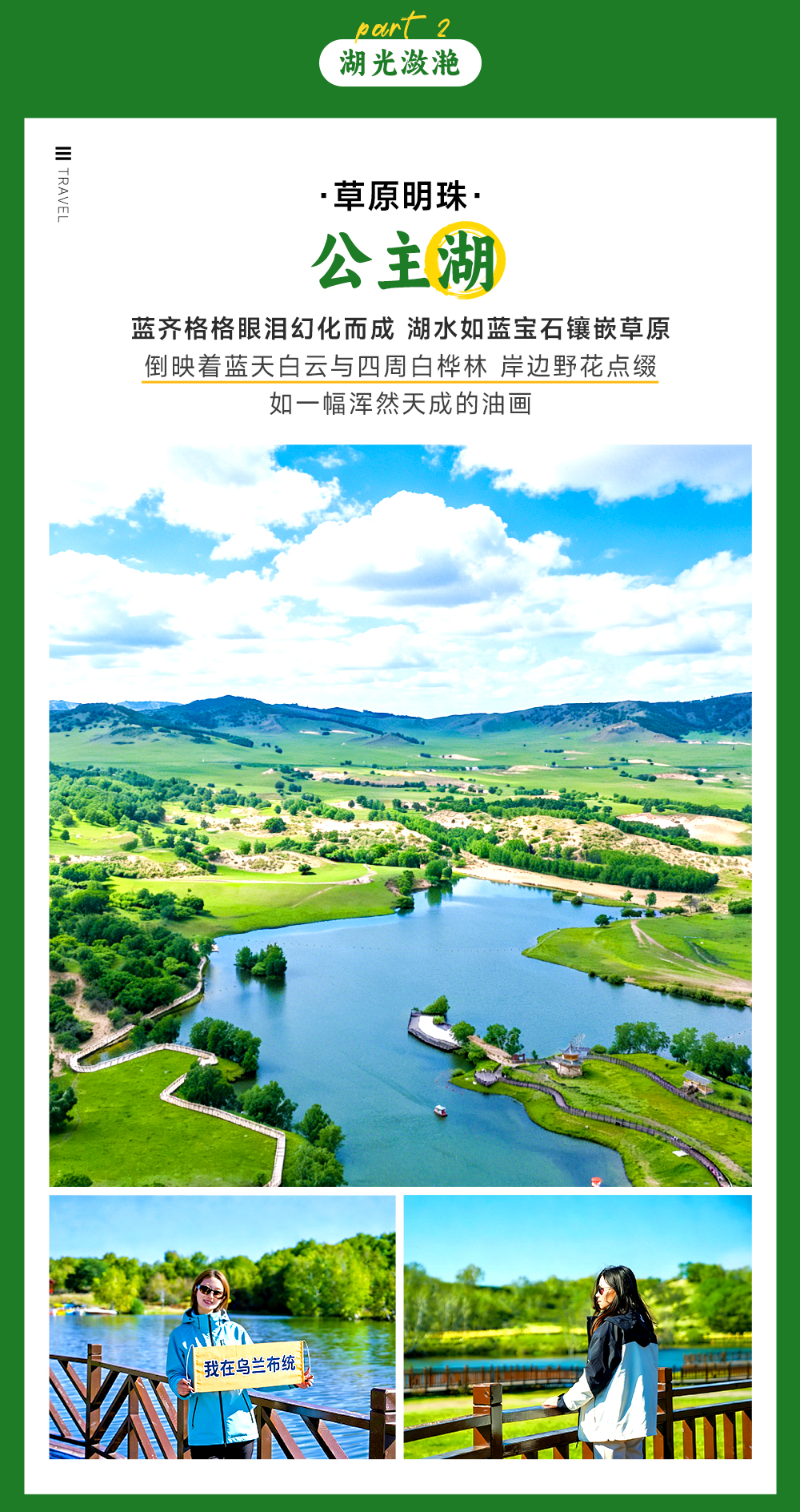 下午我们接着徒步至终点,乘车前往“蓝齐儿眼泪”的坝上明珠【公主湖】,绿林环绕湖水,湖水清凉碧绿,似梵高的油画在人间,美不胜收。沿途牛羊悠闲、白桦错落,田园村落若隐若现,日落在暮色的柔光下更显惊艳。