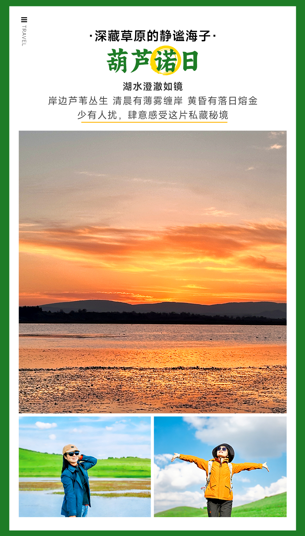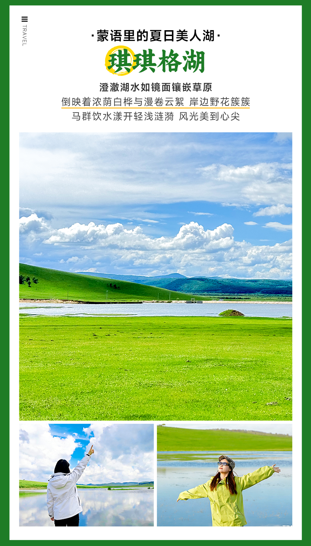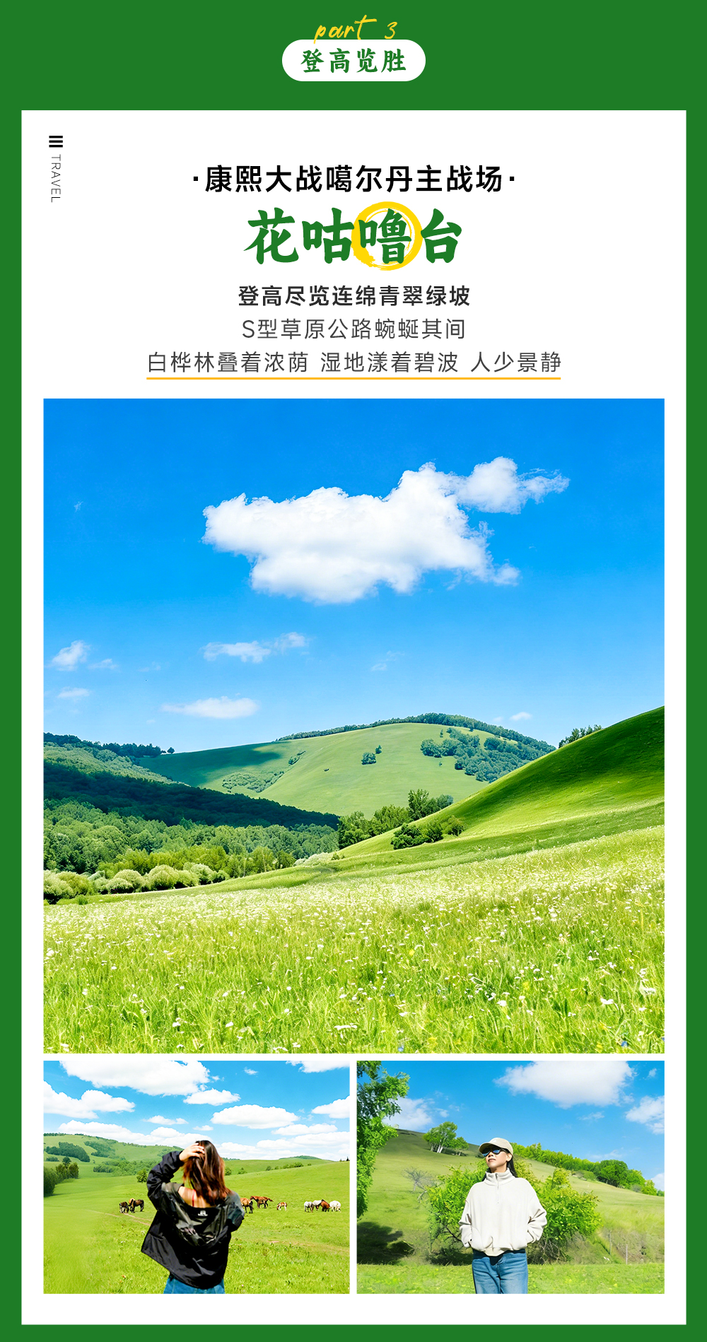 享用我们徒步简餐后,赏牛羊成群的琪琪格湖美景。夏日的乌兰布统【葫芦诺日】,这里是坝上草原特有的秘境,起伏的绿坡翻涌着层层草浪,金莲花与狼毒花铺成斑斓花毯,牛羊群在绿野间悠然踱步。天地间尽是草原的辽阔与温柔,20℃的清凉晚风裹着青草与花香,把夏日的美好揉进每一寸风光里。
