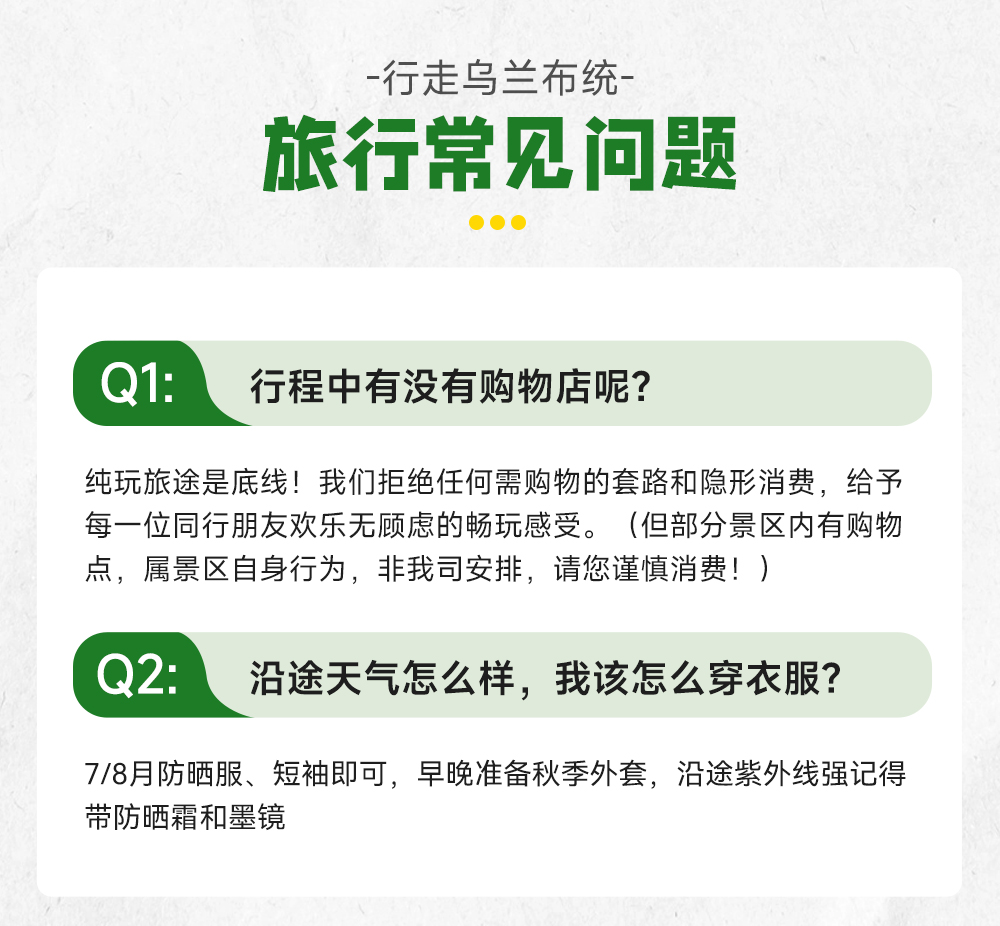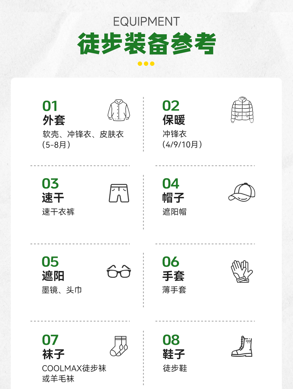 ①衣服:5/6月气温较低,需准备厚一些的外套,如夹克、风衣或薄羽绒服,也可带上围巾和手套增加保暖效果;7/8月防晒服、短袖即可,早晚准备秋季外套,沿途紫外线强记得带防晒霜和墨镜。