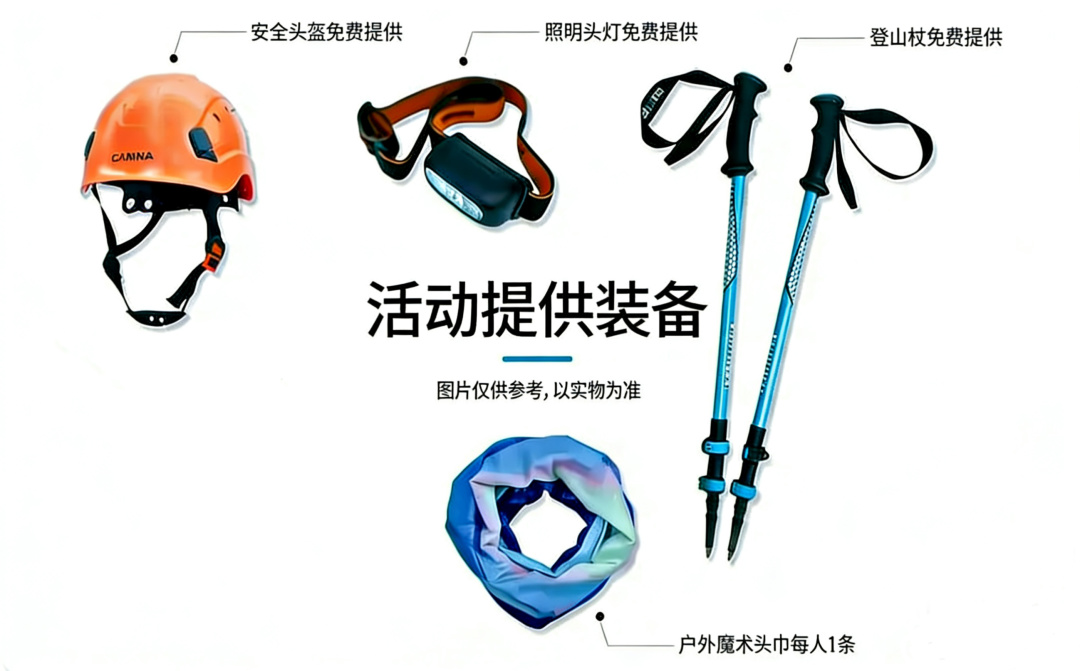 3.免费提供装备使用:头盔、登山杖各一件免费提供使用(用后回收,如需要双杖请提前告知);