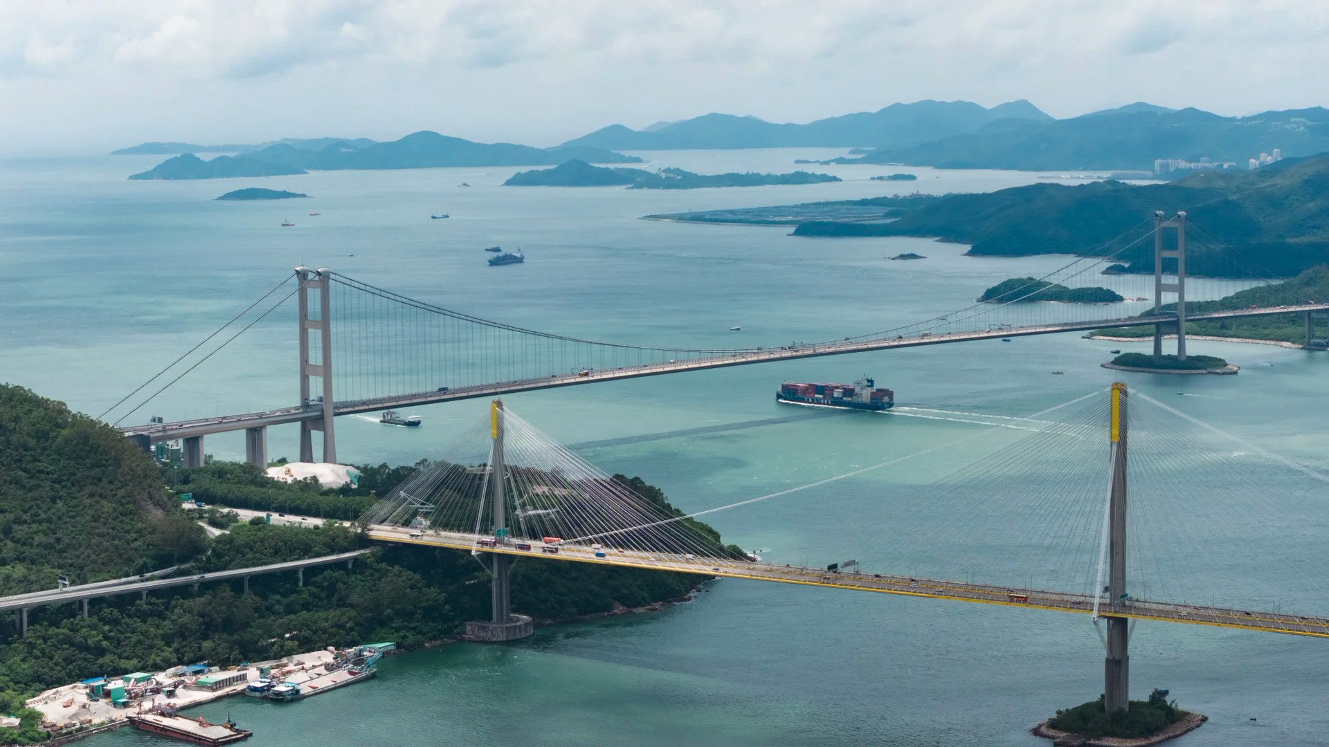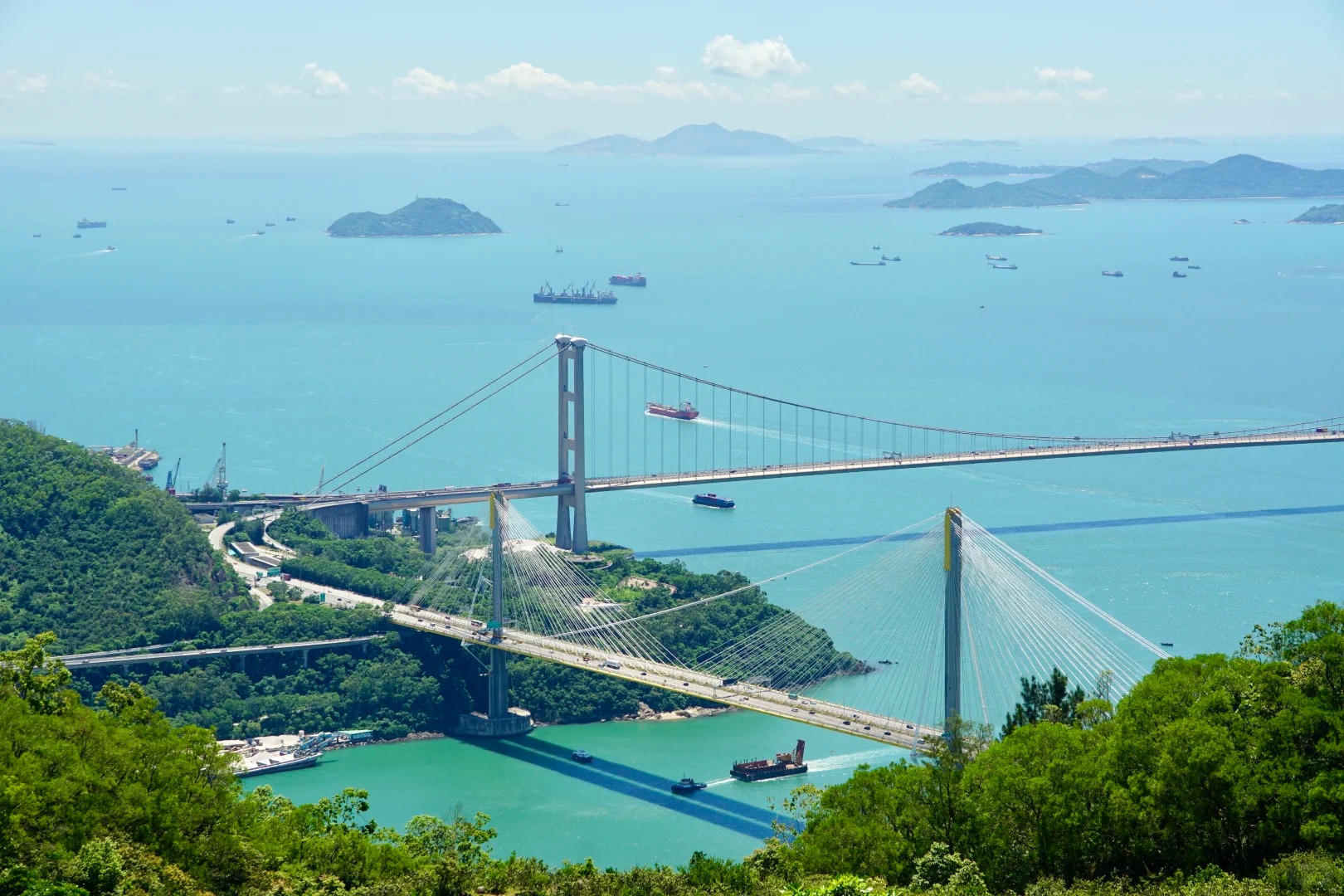 其中于1997年开通的青马大桥,全长1.377公里,横跨马湾海峡,曾经是全球最长的行车及铁路双用悬索吊桥,也是香港地标建筑之一。