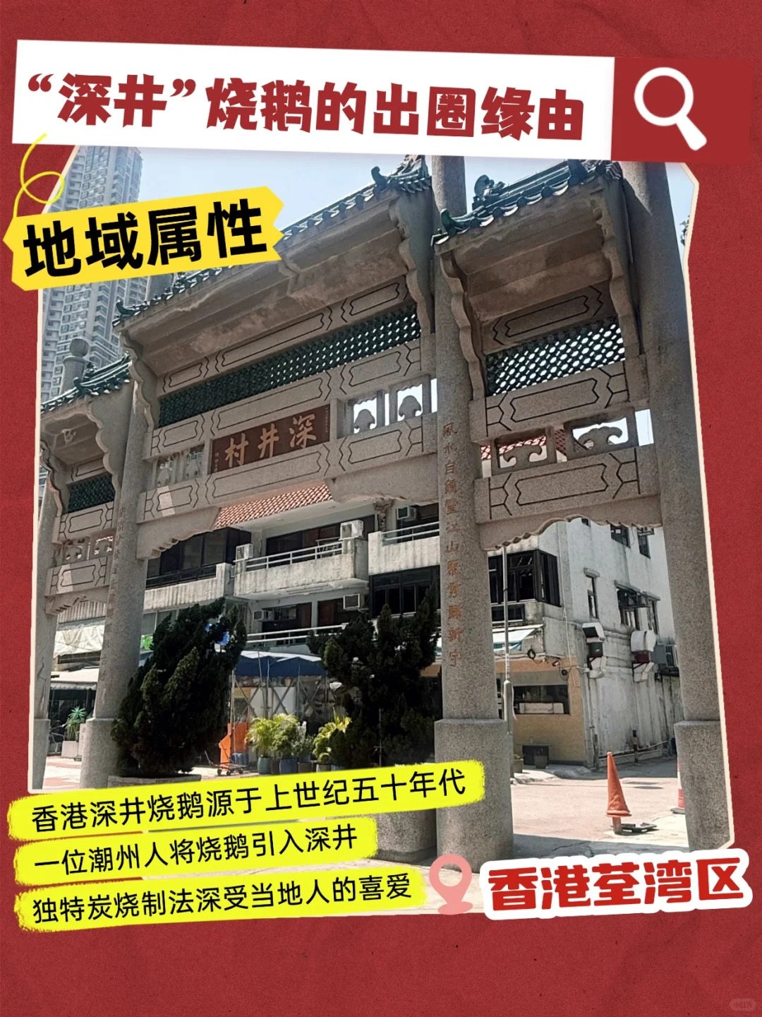 烧鹅自古由烤鸭演变而来,南宋御厨入粤后就地取材以鹅代鸭,由此创制出广式烧鹅 。香港深井烧鹅源于上世纪五十年代,深井位于香港新界荃湾,当时工业兴起吸引众多潮州人迁入。一位潮州人将烧鹅美食引入深井,采用经典炭烧制法深受工人们喜爱。【深井烧鹅】便逐渐成为香港深井的美食名片