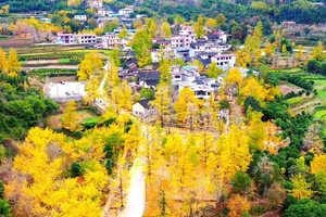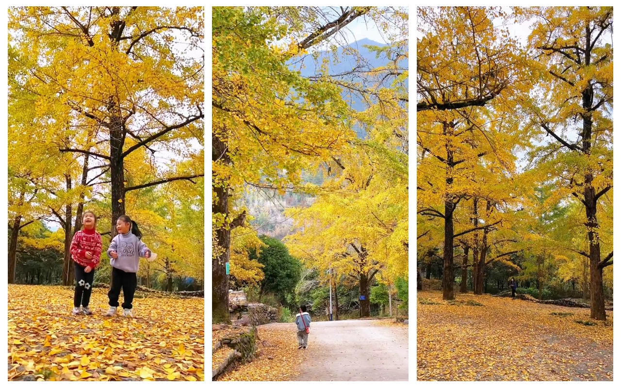 深秋时节,整个村子就成了金色的海洋,微风轻拂,落叶缤纷,片片黄叶随风飞舞,铺得满地金黄,仿如一个迷人的金色童话世界,在秋日的暖阳下让人流连忘返。村头,有村民带这自产的土特产在摆摊。村中,孩子们在银杏林中嬉戏,青砖灰瓦的房顶洒落着厚厚的黄金叶,与树底下的篱笆、近处的小溪、远处的稻田一起,构成一幅悠然恬静的田园风光画。