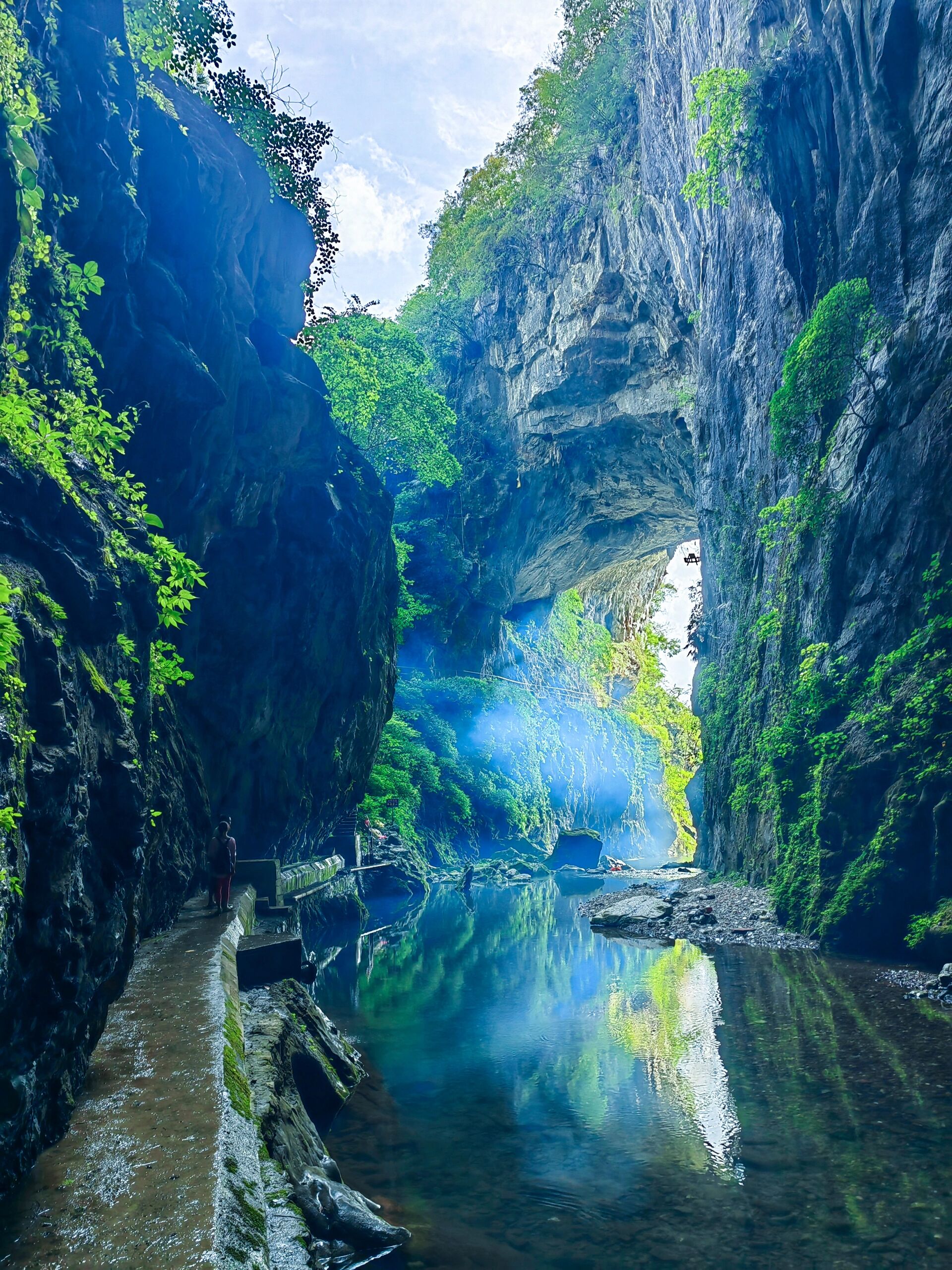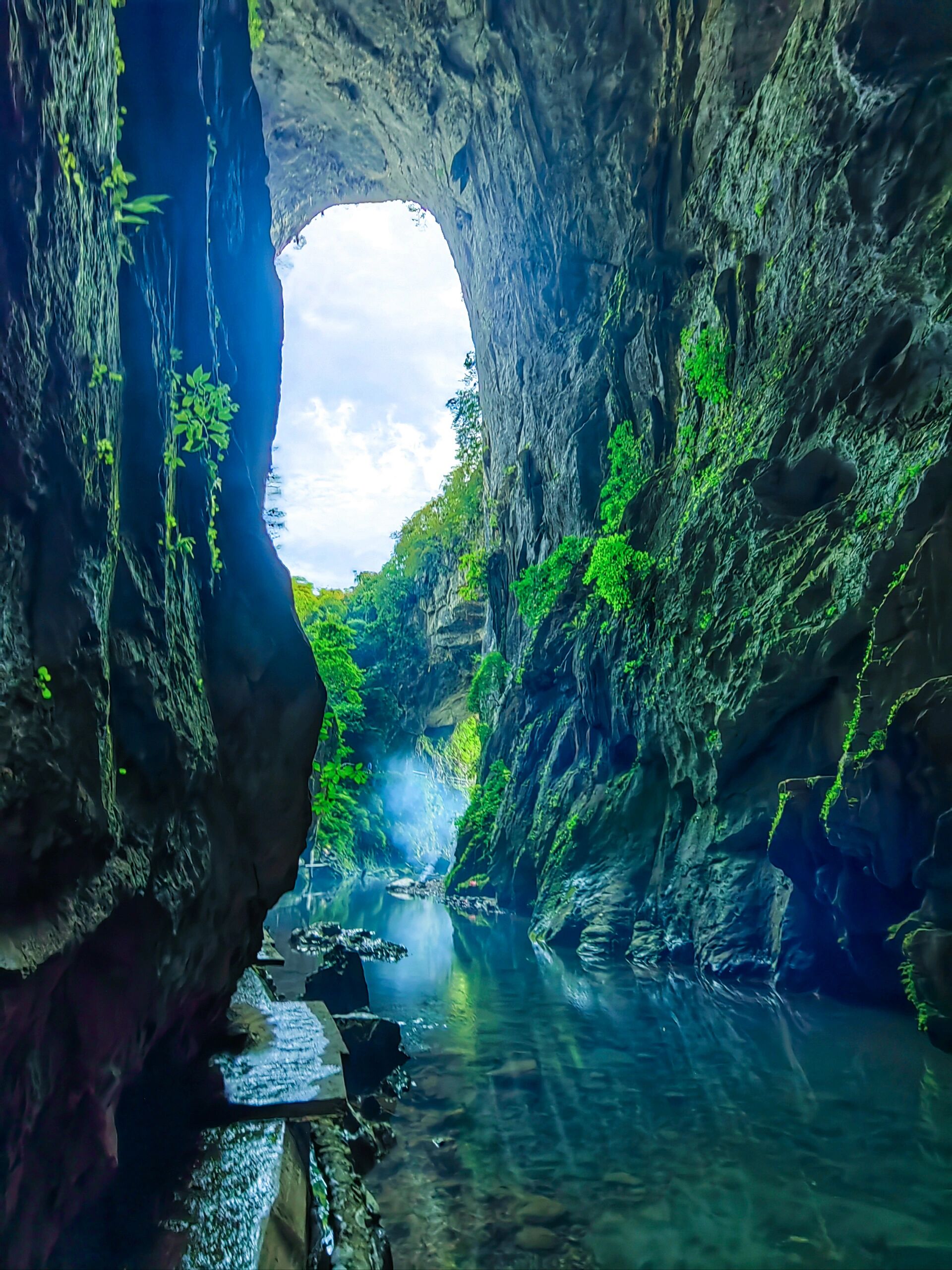 这是一个连桂林本地人看到都连连发出“卧槽”感叹的神秘天然岩洞!密林深处通幽径,拉开树帘便是大自然鬼斧神功让人震撼的作品。它是一个可内部穿越的岩洞伴着深蓝见底的水流,一路流经形成一个小平滩。