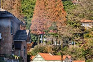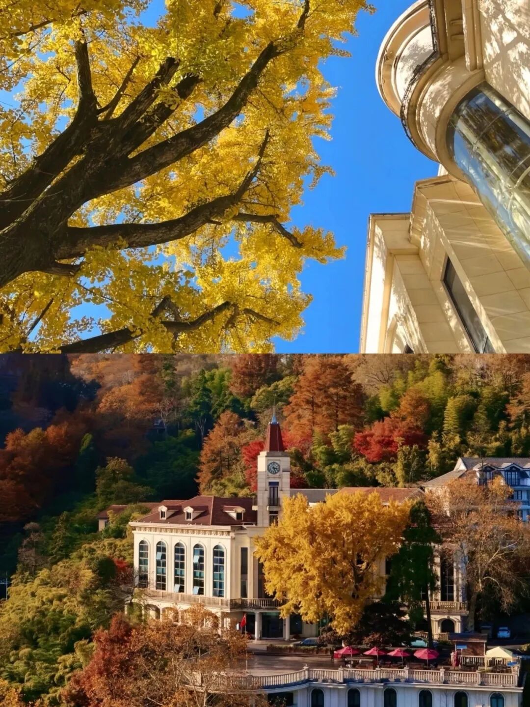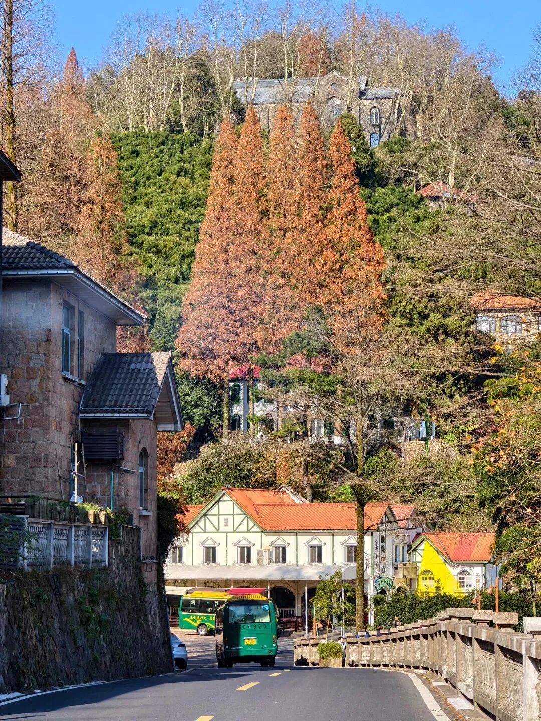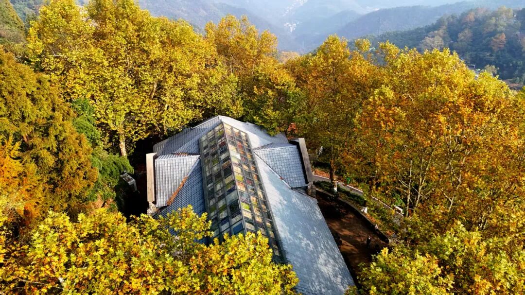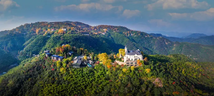 别墅秋韵是莫干山独一无二的景致。老建筑被金黄的梧桐、火红的枫香所环绕。斑驳的墙壁、复古的窗棂与飘落的秋叶交织,构成一幅极具文艺气息的画面。