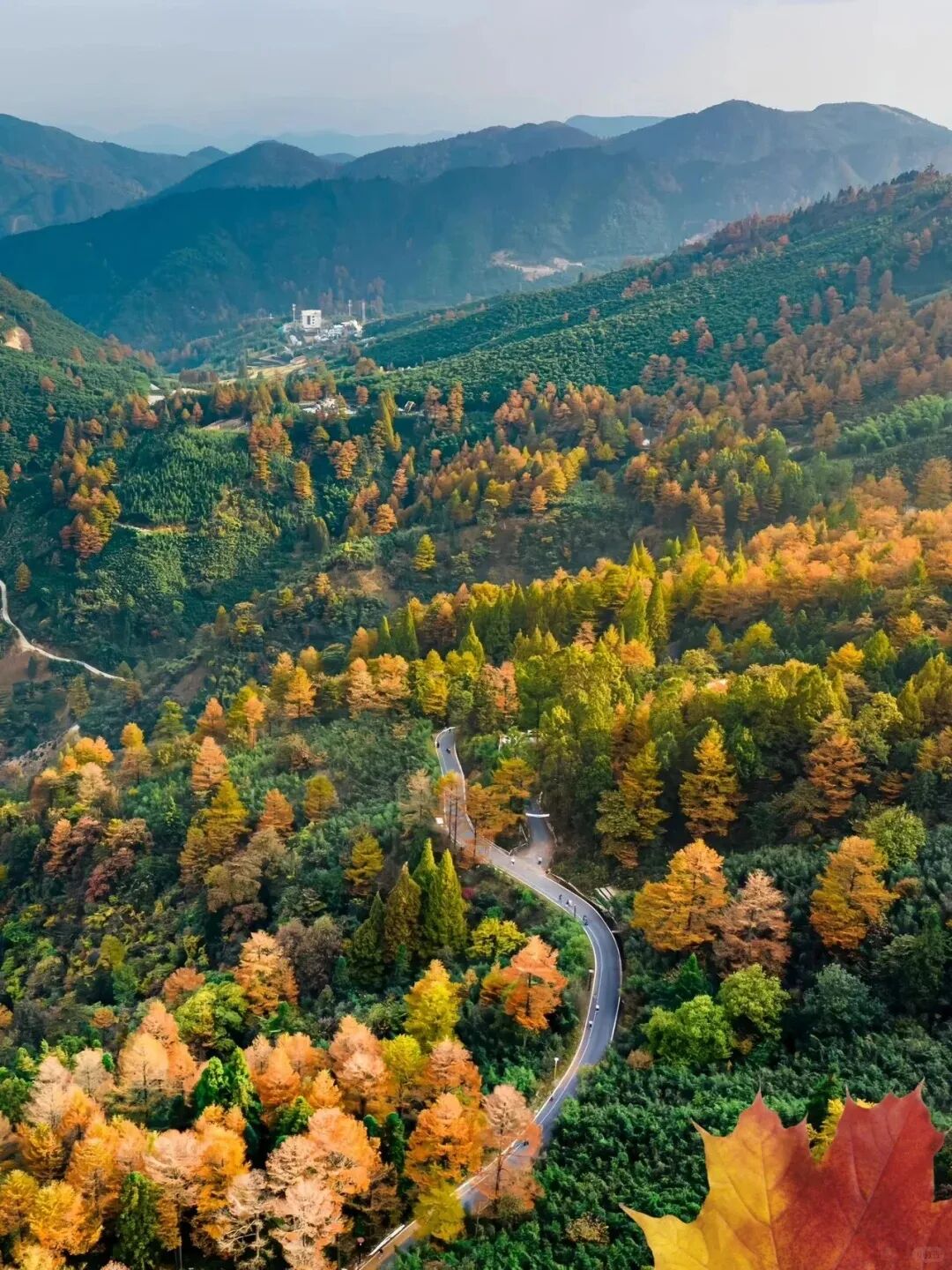 这条约 5 公里的轻徒步路线还会途经多处观景平台,我们可以从不同高度与角度俯瞰安吉县城和连绵丘陵。近处是寺院飞檐隐于彩林,远处是秋日田野层次分明,视野特别开阔。