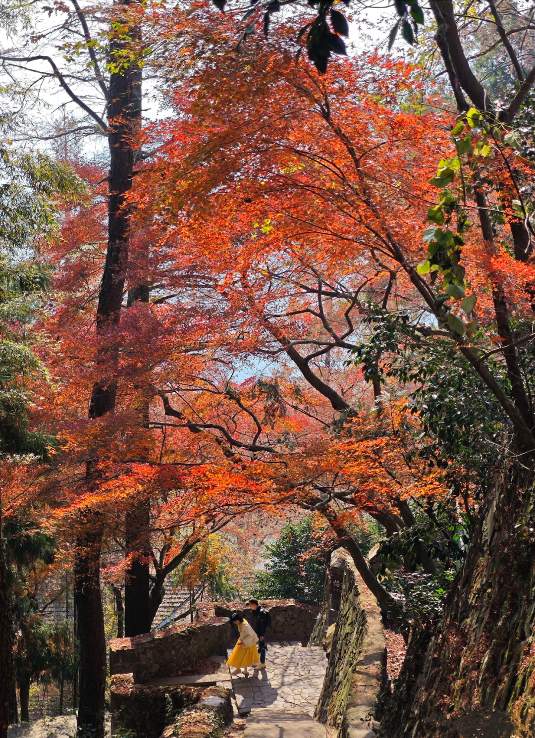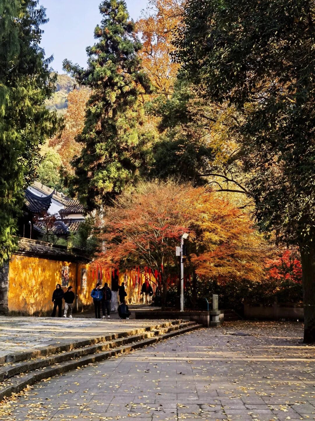 旁边几棵三十米高的枫香树,叶子红得像火,跟黄墙黑瓦的寺庙配在一起,织成一幅静谧而浓烈的禅意画卷。