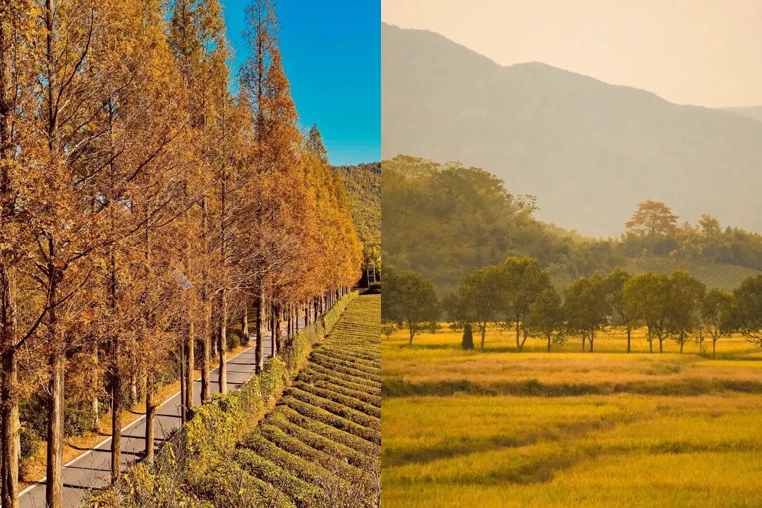 入秋之后,竹海由翠绿渐转为黄绿相间,搭配上金黄的稻田和古银杏,整个山野呈现出层次丰富的秋日画卷。