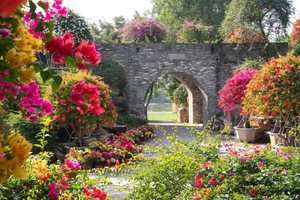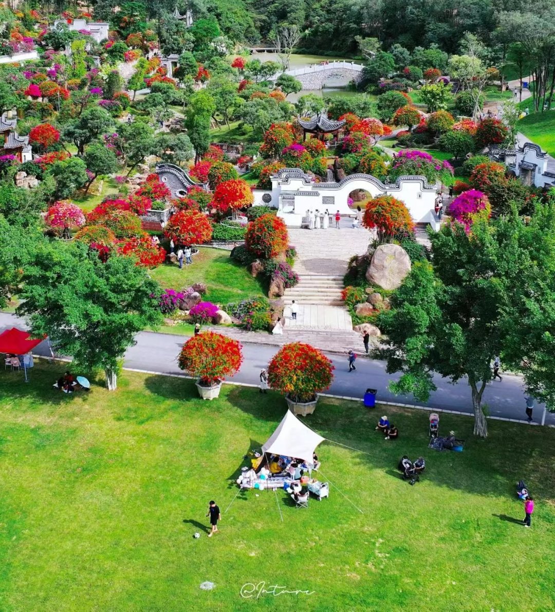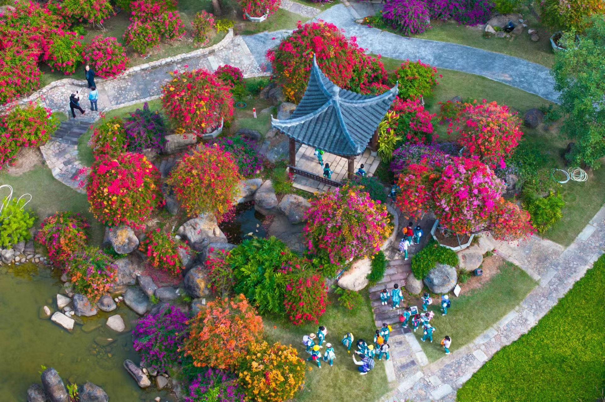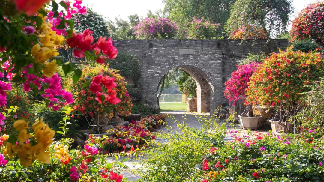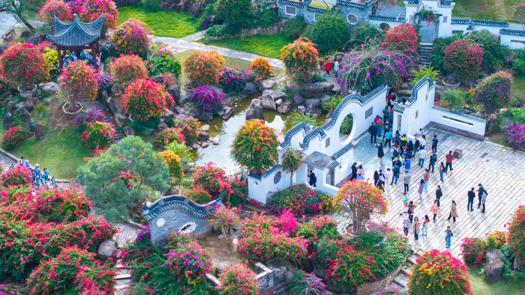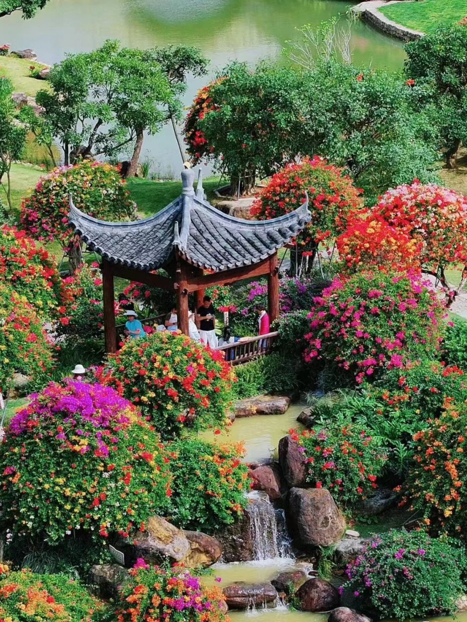 园内建筑古典雅致,亭台楼阁移步易景,与花卉景观相得益彰 。有80年以上树龄的五雀三角树嫁接五颜六色的三角梅,形成独特花海,颜色多样,姿态各异 。
