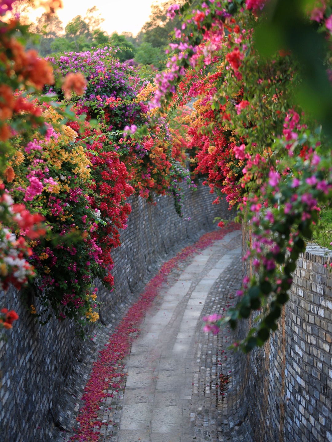 徒步见证成千上万株三角梅如瀑布般倾泻的壮丽景象。绝对是拍照打卡的绝佳背景板。我们的起沿着马岭湖畔的栈道漫步,看水光山色与繁花相映成趣。