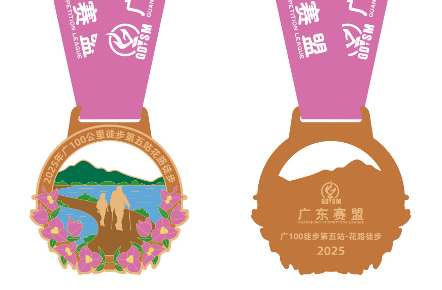 14公里征程的具象见证,完成挑战的象征:徒步马岭观花活动,对参与者来说是一次体力和毅力的挑战,奖牌是他们成功完成徒步活动的证明。