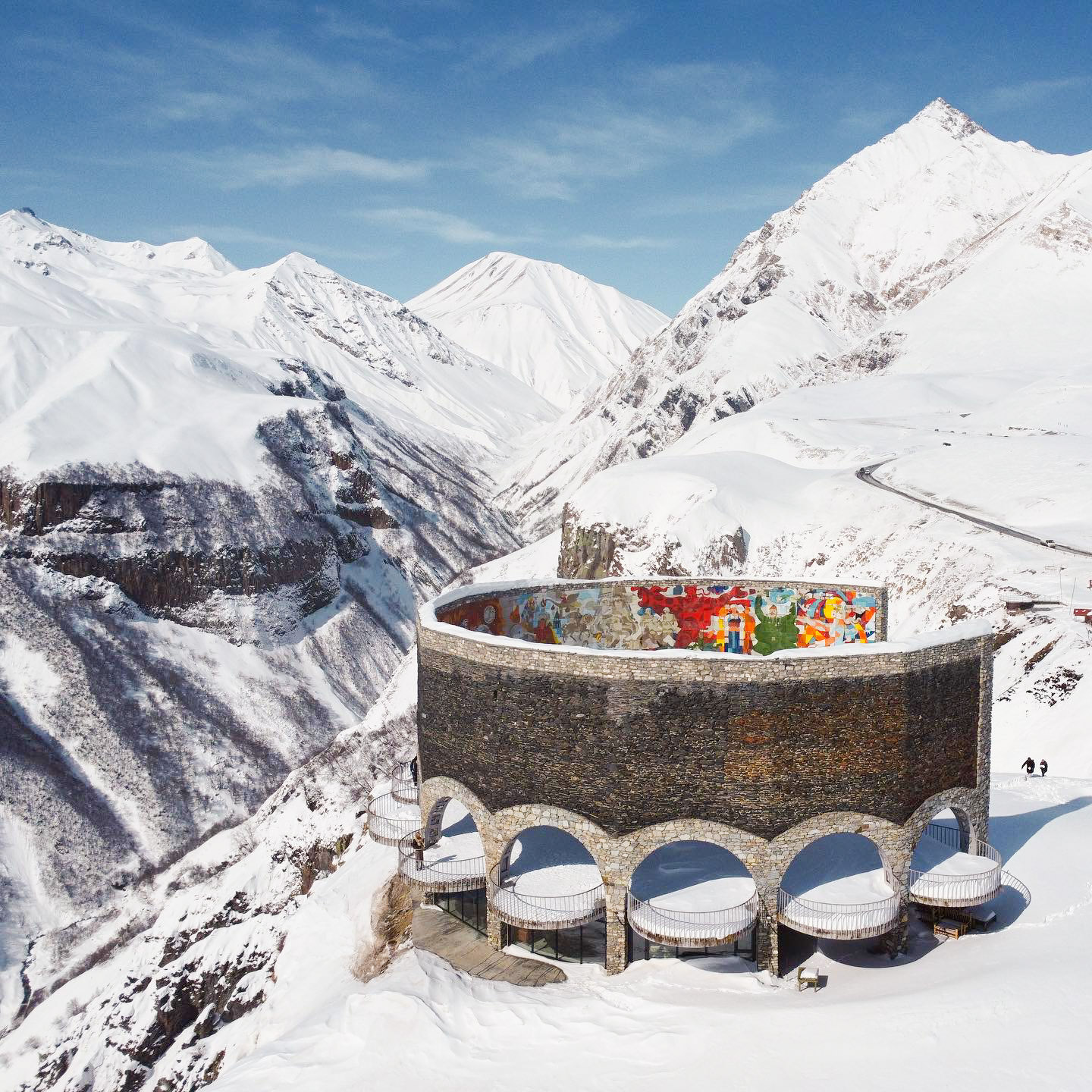 之后前往卡兹别克的路上会参观【俄格友谊纪念碑】,纪念碑修建于1983年,为庆祝格鲁吉亚和苏联的友谊持续200周年而修建的,在莫斯科的一处广场立有与该建筑对应的纪念碑。