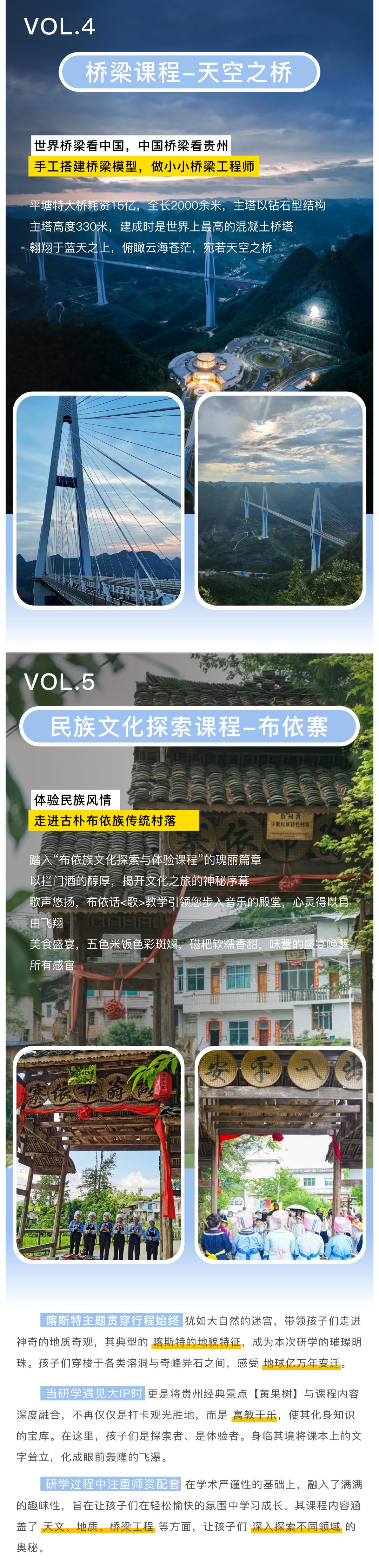 “世界桥梁看中国,中国桥梁看贵州”,贵州桥梁几乎包揽了当今世界上的全部桥型,一座座的大桥像是一把把打开大山禁锢的钥匙,也更是孩子们了解桥梁工程科技和研学大国重器的重要课程载体。为此,我们安排了特色活动【搭建桥梁模型】课程,小朋友们将化身小小工程师,通过一系列生动有趣的学习和实践环节,深入了解桥梁的奥秘。这是一次从书本走向生活,从课堂走向社会的研学活动,通过了解桥梁科技的伟大成就,激励小朋友们投身科技创新,树立成为大国工匠的远大目标,增强对于“中国力量”的自豪感。