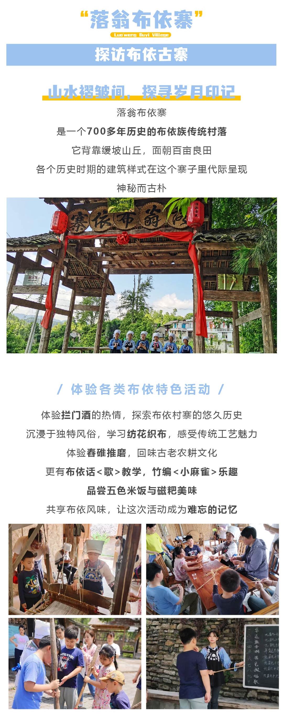 今天旅程的起点从拦门酒的热烈欢迎开始,您将深入了解村寨的悠久历史与独特的布依族风俗。随后,亲手体验仿花织布、舂碓推磨的传统工艺,更有机会学习布依话<歌>与竹编<小麻雀>的乐趣。美食环节,品尝地道的五色米饭与磁粑,让您味蕾大开。最后,享用丰盛的中餐。