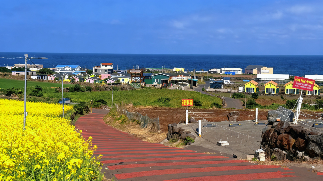 鹿山路:位于济州东线,以樱花与油菜花交织的梦幻景观著称,被誉为“济州岛最美春天道路”。 此处有草坪、风车及集市,非常适合人像摄影。