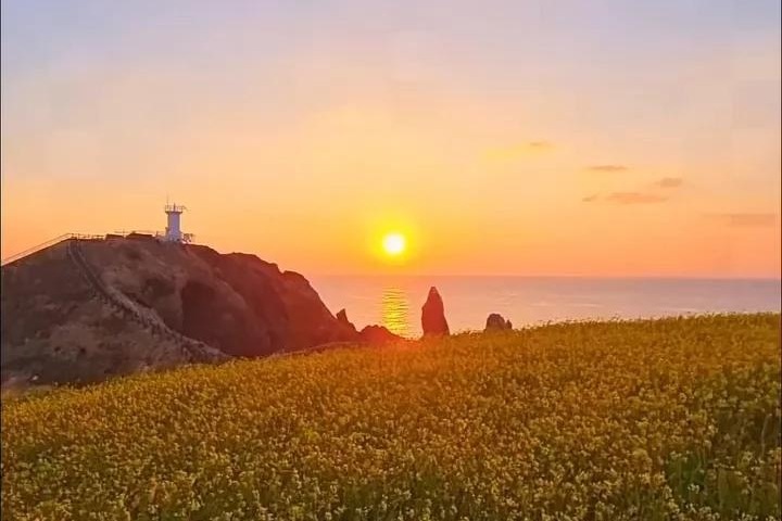 随后旁晚时分,涉地可支徒步打卡,此刻正好赶上太阳落山,夕阳洒在身上,柔和的金黄色阳光洒在草地和花朵上,与远处蔚蓝的大海和白色的灯塔形成绝美的对比,仿佛置身于天堂。