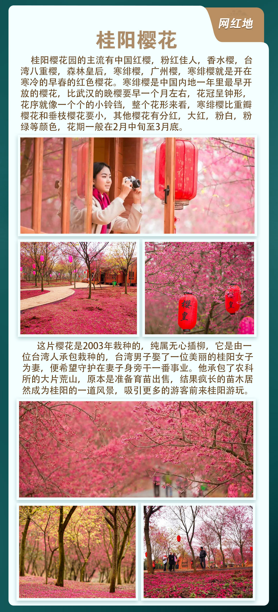 景点:桂阳樱花,莽山五指峰电瓶车,九龙水寨竹筏,高椅岭
