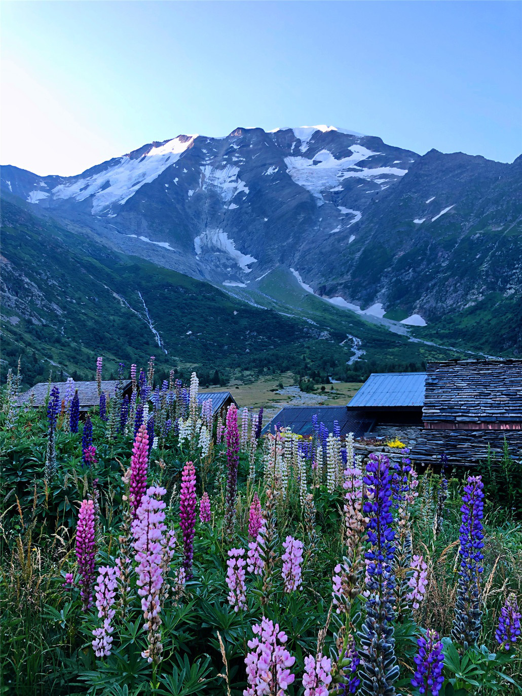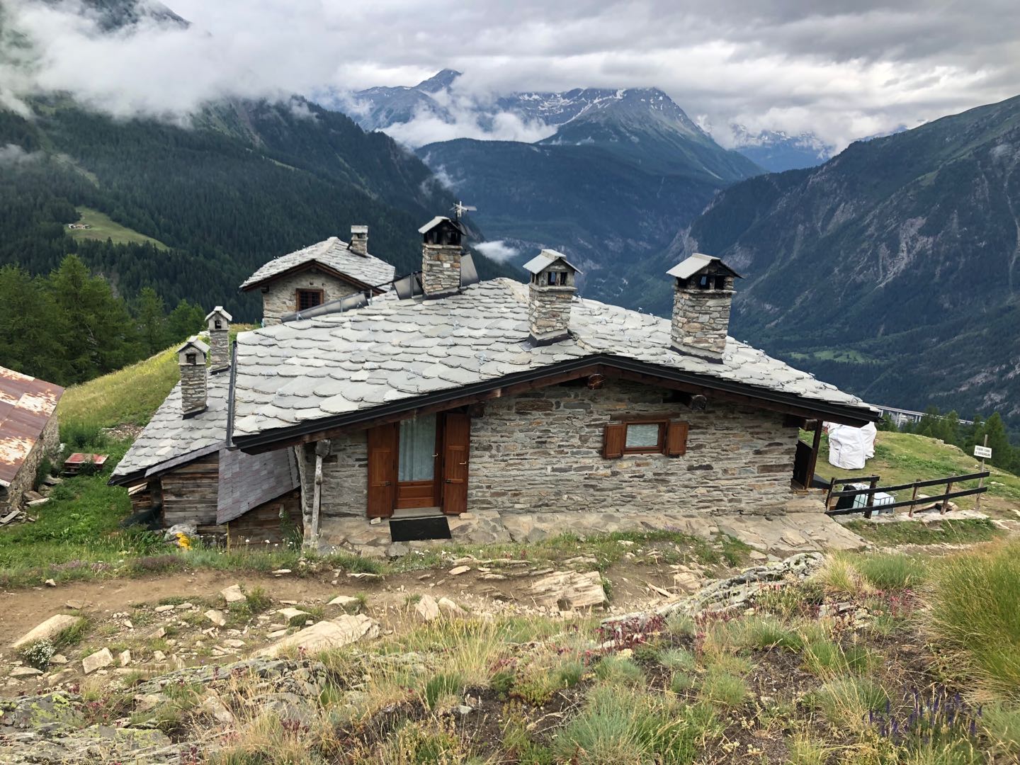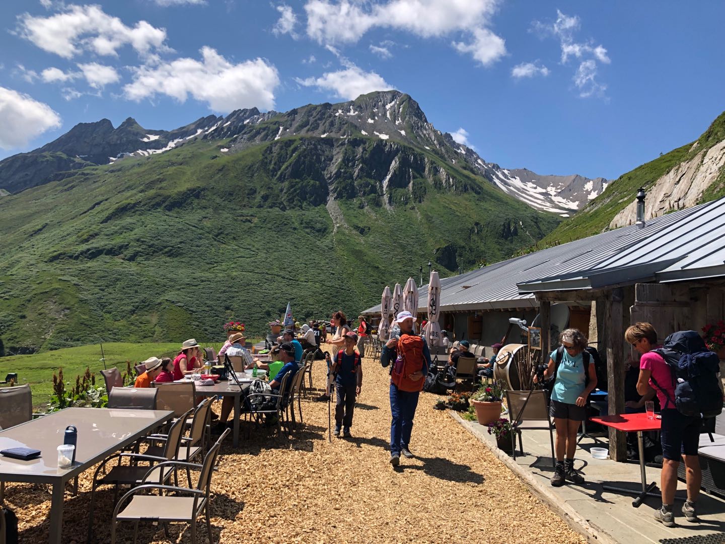 我们穿过拉贾小屋(Chalets de la Raja),在博诺旅舍(Bonhomme,2639米)稍作停留,每一个高山小屋,都坐落在让人感叹的绝佳观景点。也许,经过一路以来的行走,我们已经不像前半程对于每一次日照金山的欢呼雀跃,此刻的我们,只是静静的行走,品味着心中慢慢积累和满满溢出的点滴感动