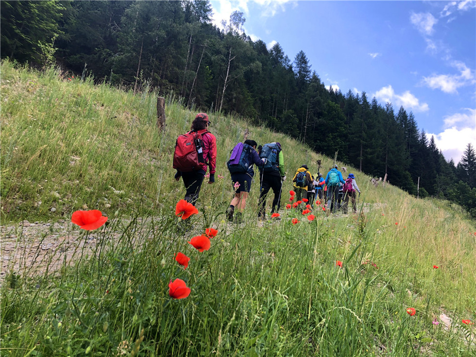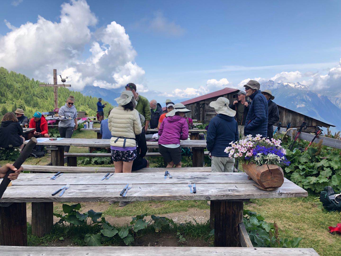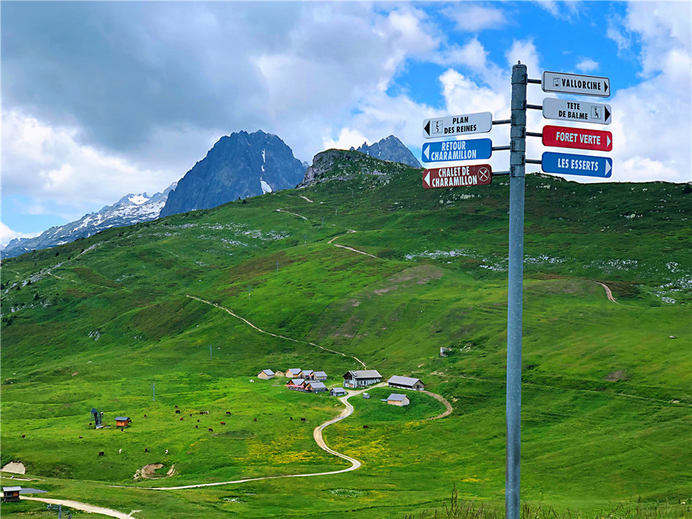 早上从Le Tour吃过早饭开始往上爬,树林里面钻了不久,就进入了草甸地带,这里草甸开满鲜花,进入瑞士地界,开始翻越海拔2191米的Balme垭口,我们在垭口的木屋休息午餐,然后开始下坡,当看到一个粉红教堂,就到今天的目的地Trient小镇。