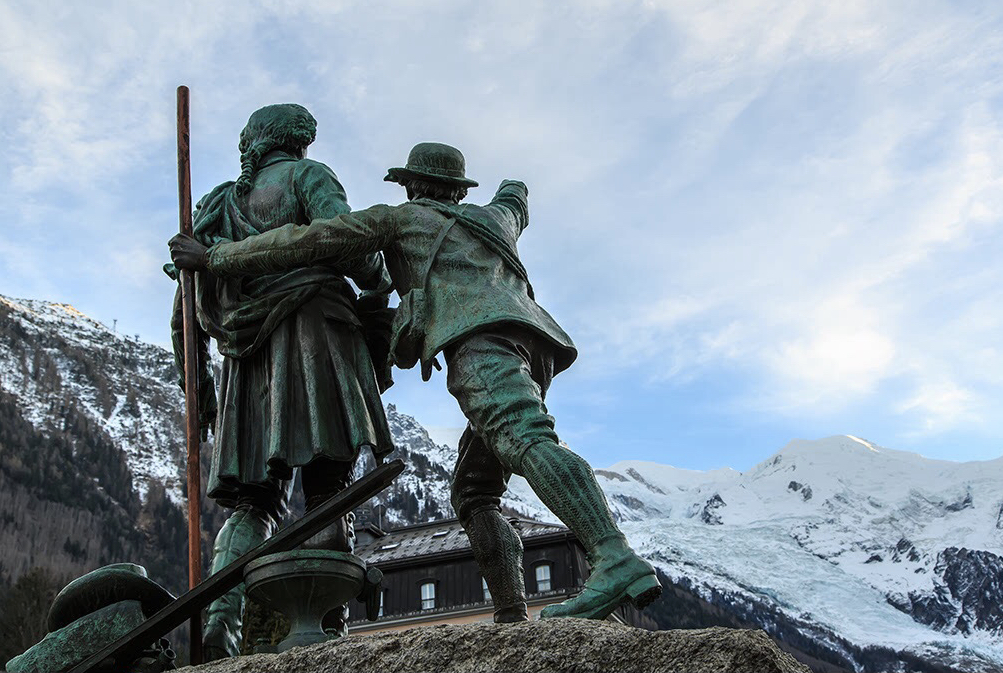 霞慕尼小镇是我们徒步起点,传说也是通往天堂起点,小镇耸立一塑雕像就是讲述的便是波尔马特Balmat正在给索绪尔Saussure指勃朗峰登顶路线的情景。