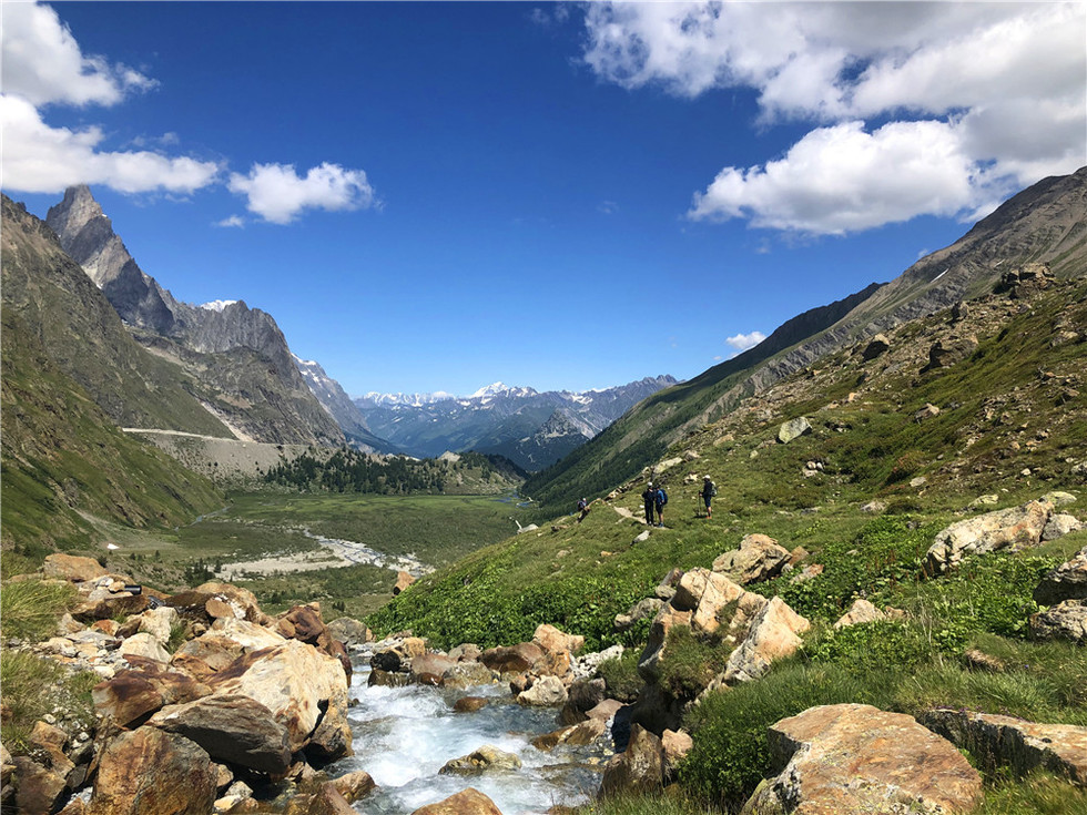 穿越瑞士的费丽峡谷(Val Ferret),沿途经过充满魅力的小村庄、木屋和传统粮仓。冰川景观随处可见,包括萨利纳冰川(Saleina Glacier)和新冰川(A Neuve Glacier),最终抵达富丽(La Fouly)村庄完成第五天的徒步。