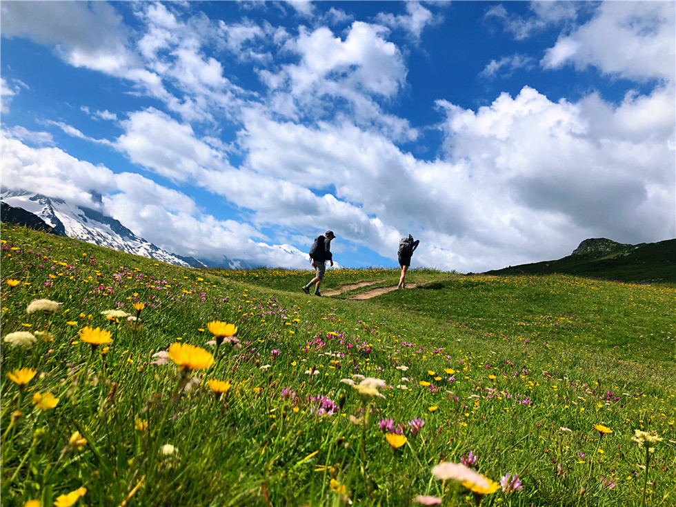 这是徒步旅行者此生一定要去的地方 这次旅行一定让你心潮澎湃叹为观止 深度体验欧洲三国文化 在最美的时节走全球最酷的徒步线路 蓝天上的白云和地方的鲜花 绽放在阿尔卑斯山谷雪峰 瑞士山下的小木屋 嵌在芬芳馥郁的翡翠大地 恰如宝石般熙和莹亮