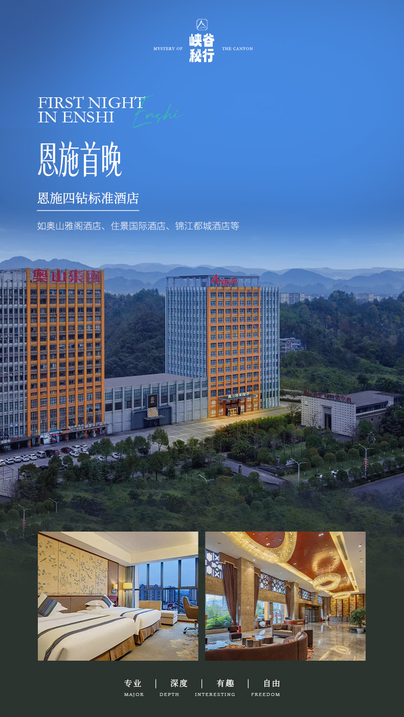 2.住宿:大峡谷三星民宿2晚(参考峡谷明珠酒店等)、恩施四星酒店1晚(参考住景国际酒店、奥山雅阁酒店、锦江都城酒店等);