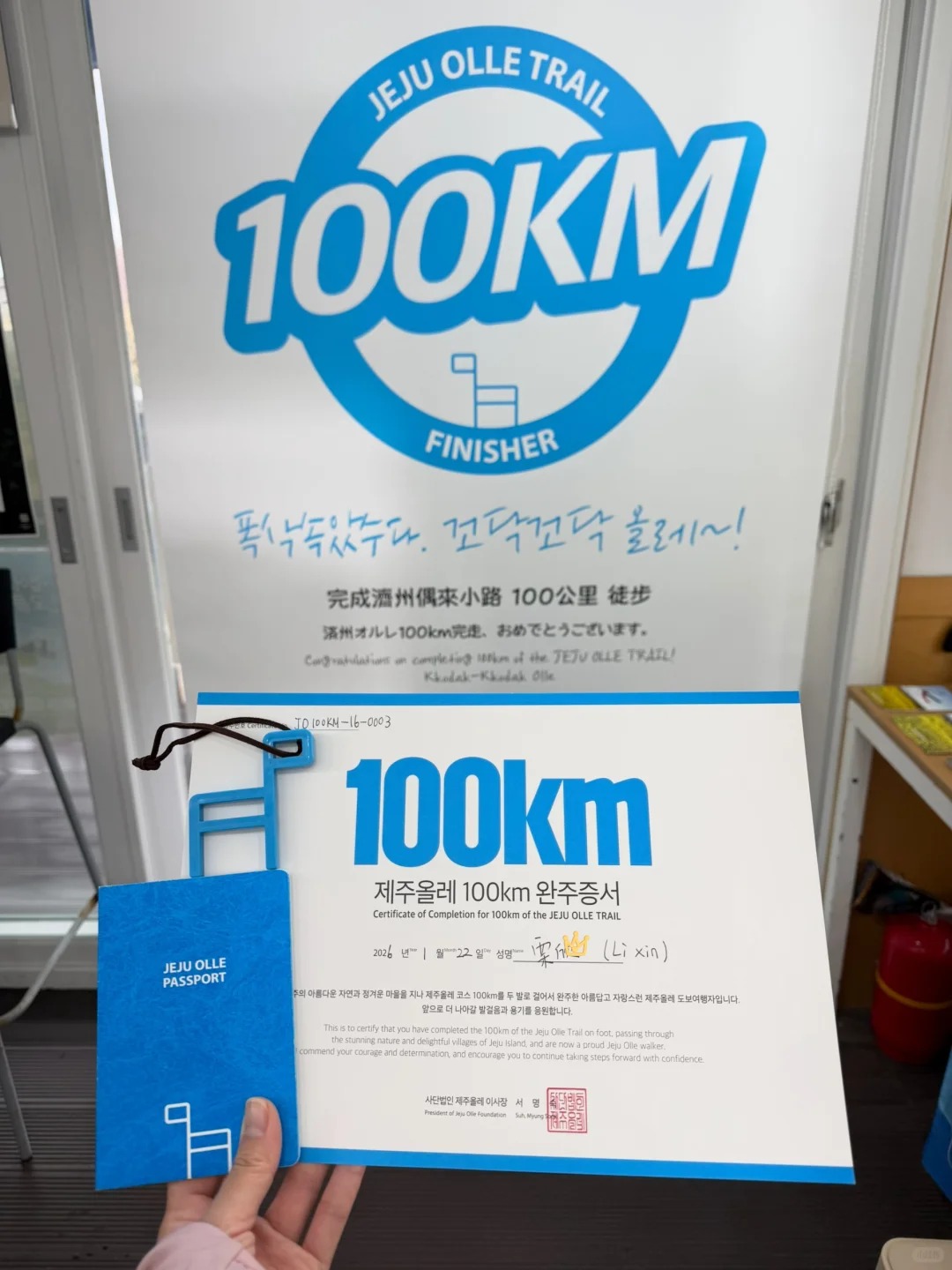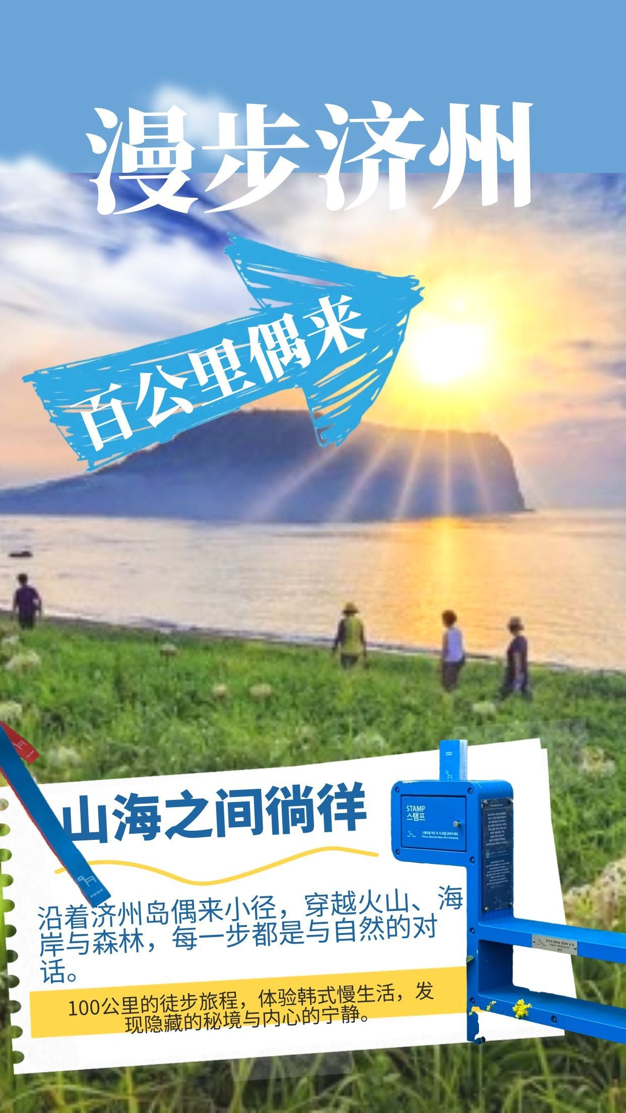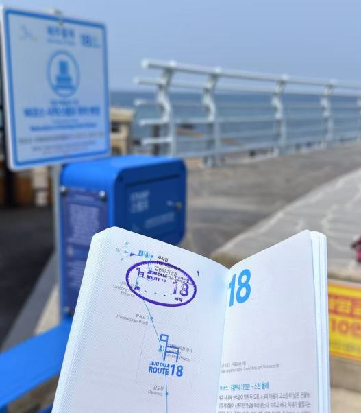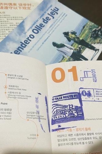 早餐后退房,将行李统一寄存前台。今天我们将完成100km。到达孤根山脚下,我们沿着步道而上,没多久到达山顶,蓝色小马就在我们面前,盖完章下山,路过翁渡瀑布,来到西归浦客运站,这里是7号线的终点和7-1的起点。